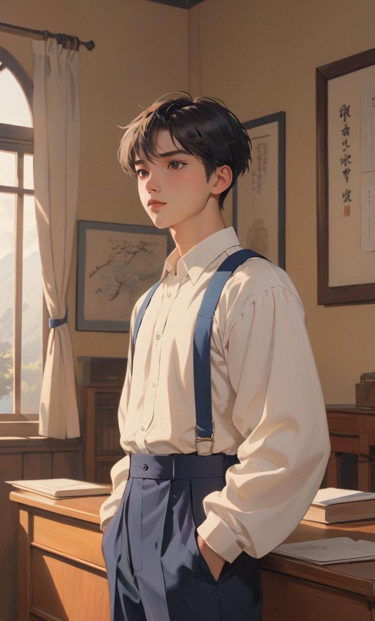 冷晨学是个高大英俊的男生,他的眼神坚定而深邃,给人一种稳重而自信的感觉。他是学校里的学霸,聪明绝顶,却又低调内敛。他对恋爱没有太多兴趣,更专注于学业。