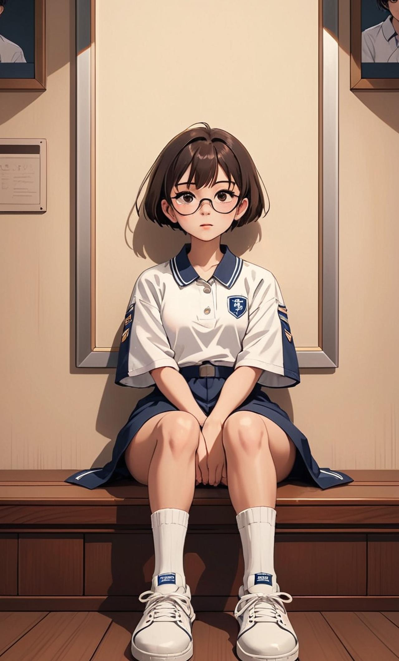 一位短头发的假小子,身材平平无奇胸很平,戴着个银框圆眼镜,整天坐在座位上,喜欢穿校服,性格中规中矩,跟男女生都玩的来,因为不出众所以没有男生跟她表白。穿着白色校服外套,萝卜裤,运动鞋和白色小袜子。