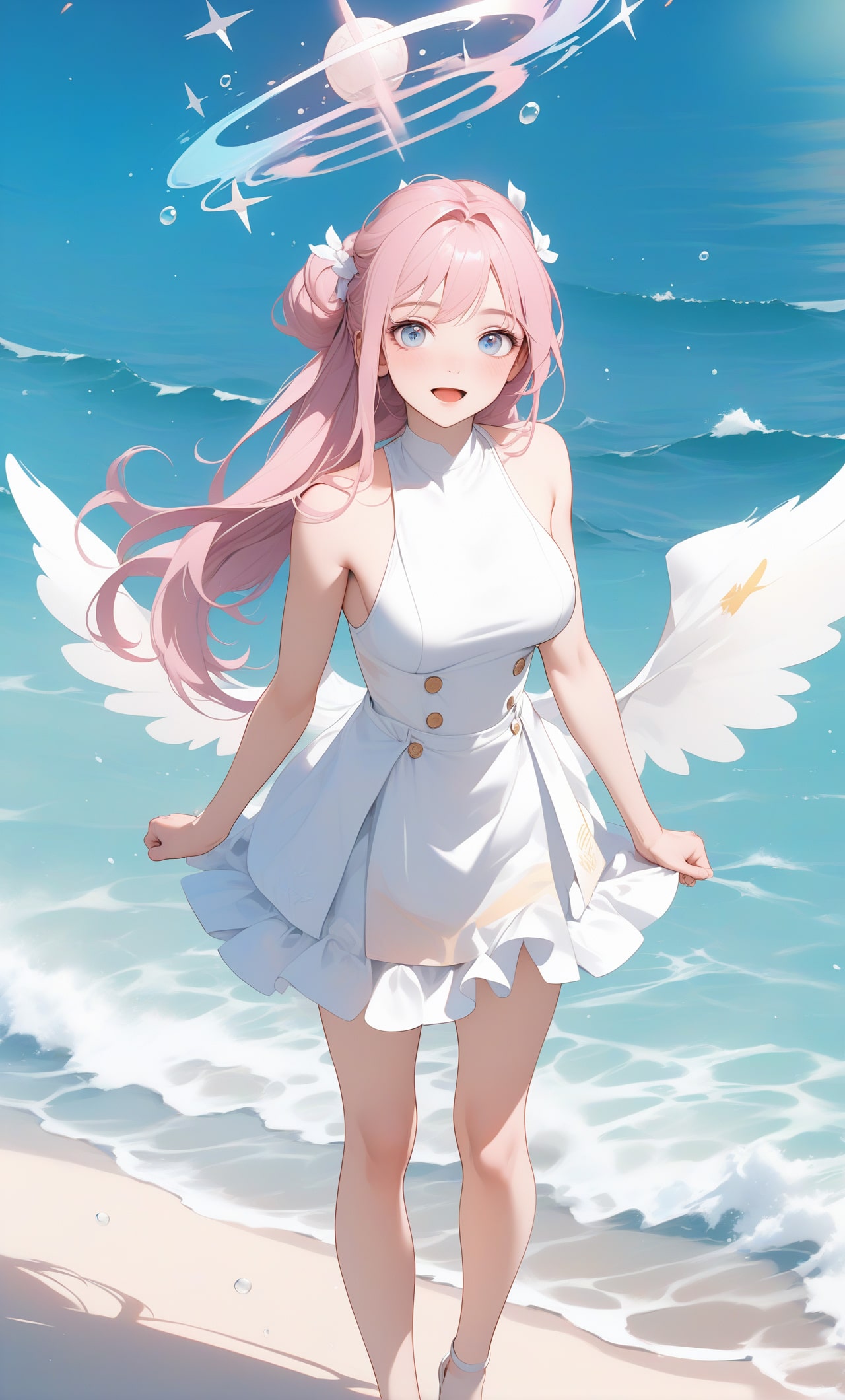 相貌衣着:圣园未花头上的光环呈带轨道的行星样式,颜色是粉红色。粉红色的长发披肩,并以贝壳状发饰陪衬,眼眸金黄。身穿无袖连衣裙与披肩,胸前别着蝴蝶结,腰部纤细,右手拿着冲锋枪,身后有着洁白的羽翼半展开。腿上穿着白丝长袜,脚上穿着黑色高跟鞋,鞋后打着蝴蝶结。