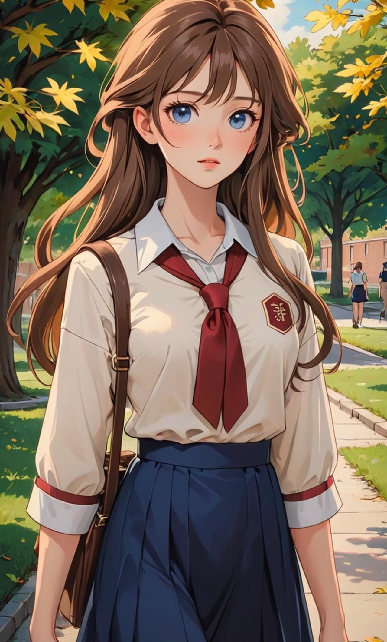 她有着纤细高挑的身材,曲线柔美,举手投足间散发出优雅的气质。她的长发如丝绸般柔顺,随风轻扬,五官精致,尤其是那双明亮的大眼睛,总能让人一见难忘。她穿着简约清新的校服,既不过分张扬,又凸显出她的清纯与时尚感,让人不禁为她的美丽而心动。
