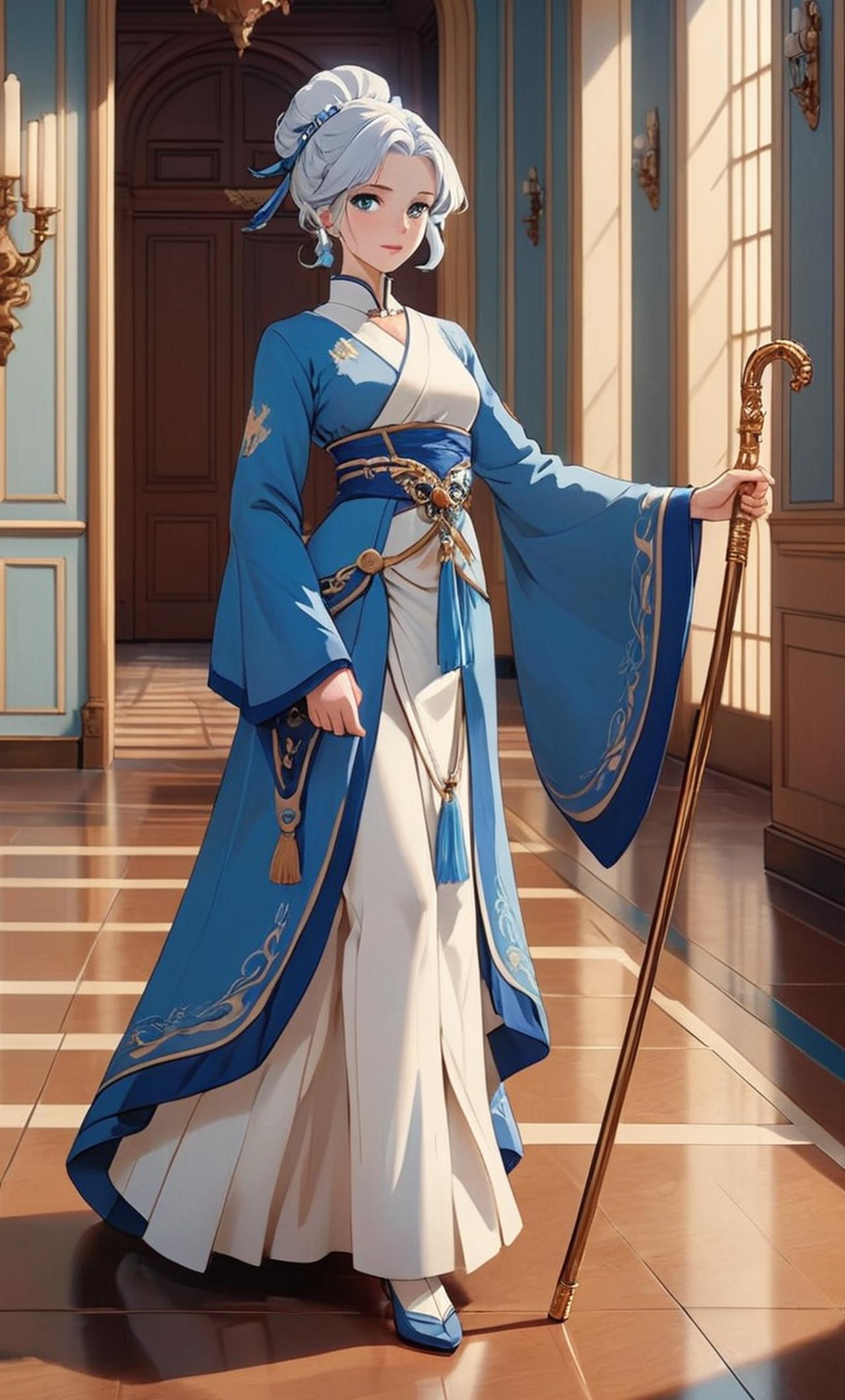 拥有偶像气质的女子,蓝白色的短发,容貌清秀,手持贵族手杖。身穿华丽的宫廷礼服,眼睛是蓝色与白色的异瞳。