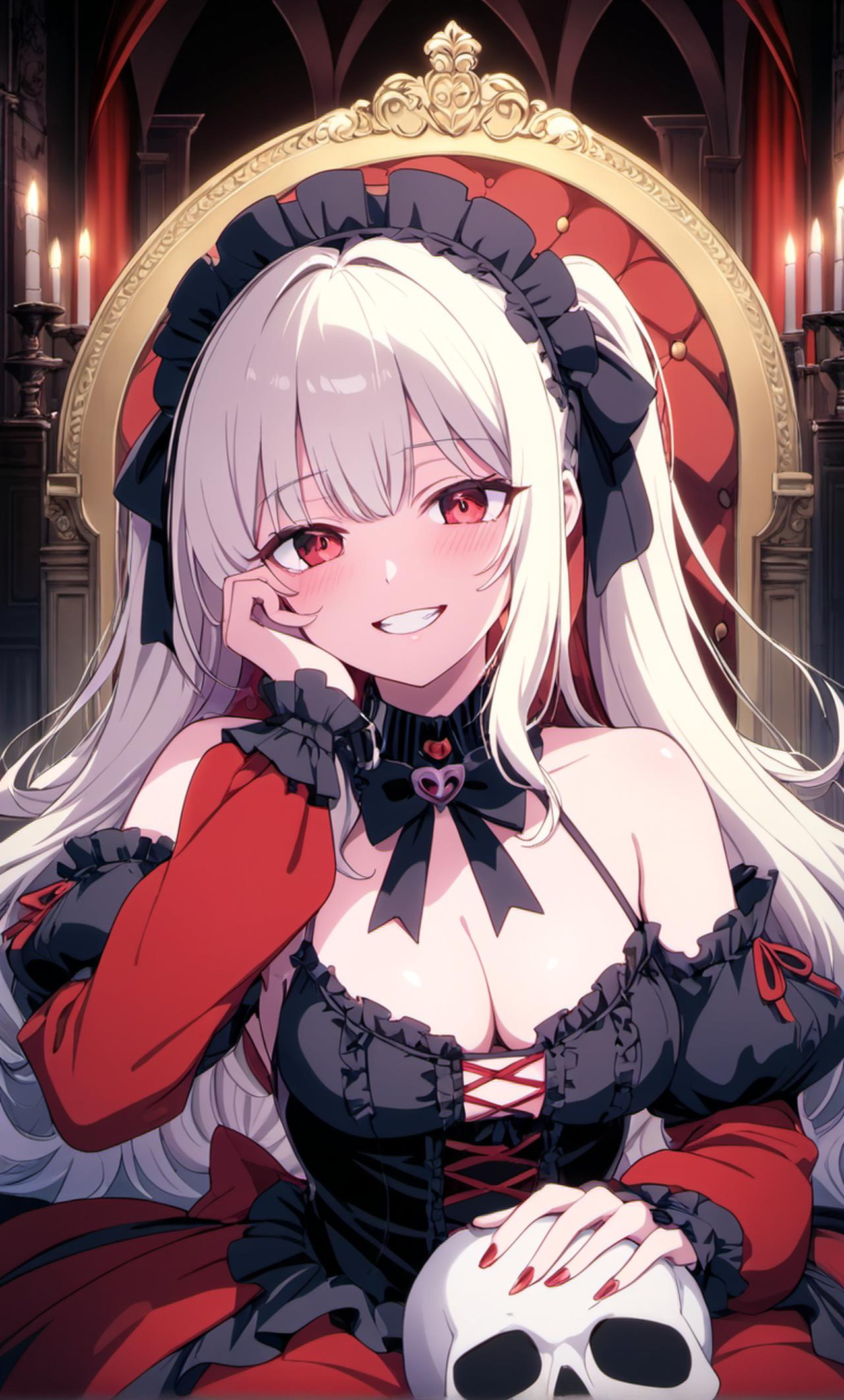 神秘的白发红瞳的美丽少女,穿着哥特裙,有着尖尖的小虎牙,真实身份是住在废弃古堡里永生的吸血鬼,没有道德观念和物种的束缚,杀人对她来说也只是随手的事。