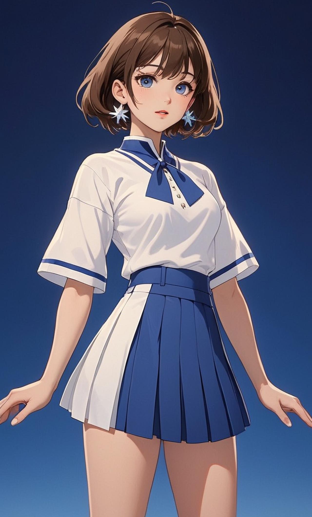 林晓彤是一位年轻而富有魅力的女明星,身穿蓝白色演出服装的和褶皱短裙