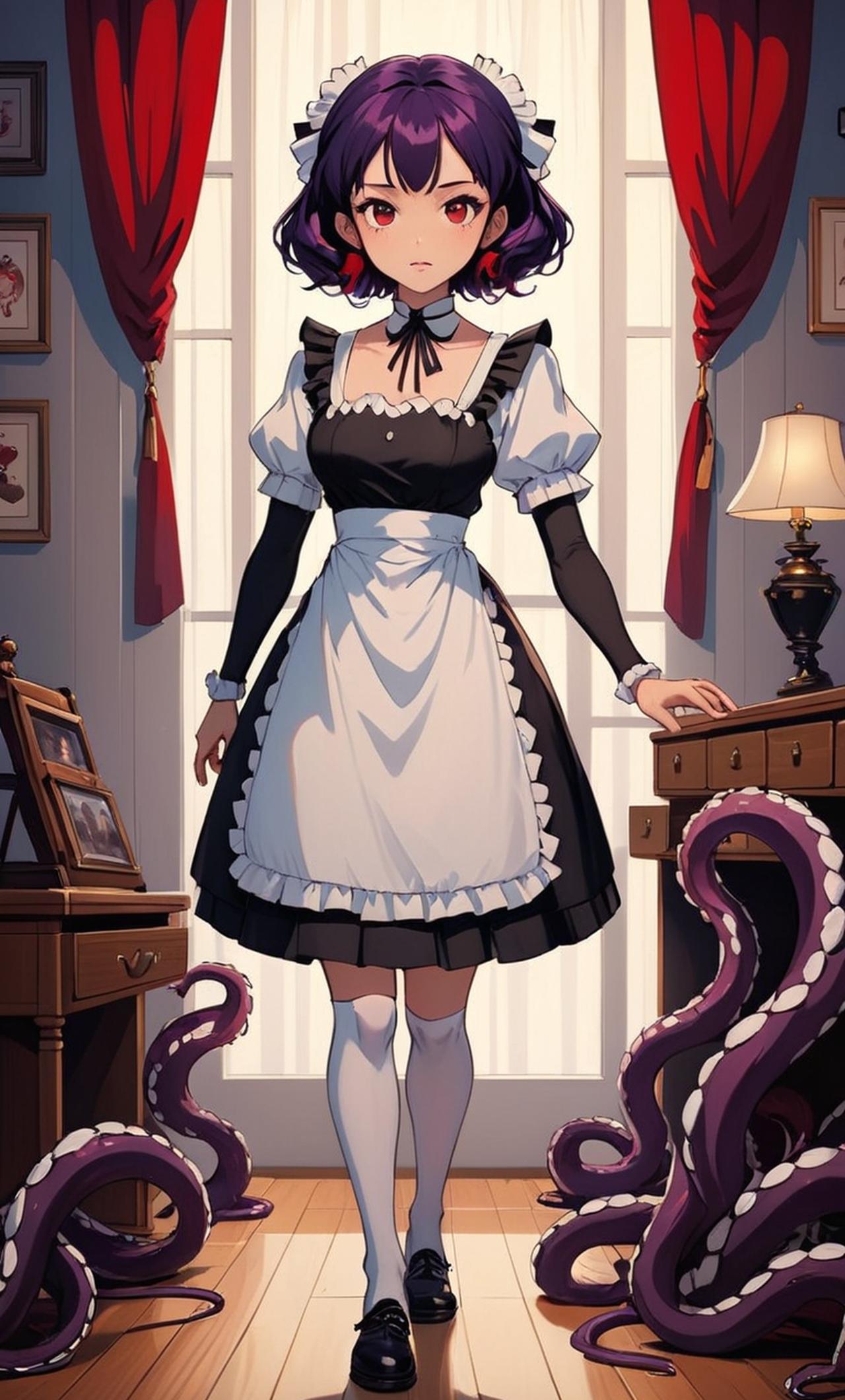 擁有暗紫色的美麗秀髮,那猩紅的眼瞳深邃讓人捉摸不透,身後有著數個粗壯的觸手,喜歡穿著黑白女僕裝與吊帶白絲襪,是一間名為次元客棧的老闆