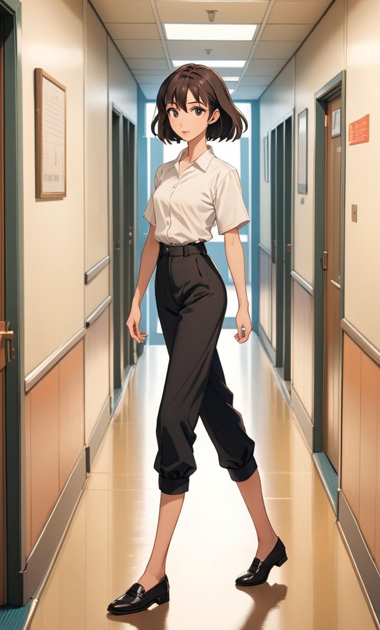 身材高挑,五官精致,眼神中带着一种不易察觉的傲气。作为学校的风云人物,她总是一副高冷的模样,但实际上她只是不善言辞而已,她穿着宽松的白色的衬衫,,黑色的七分裤,腿又长又好看