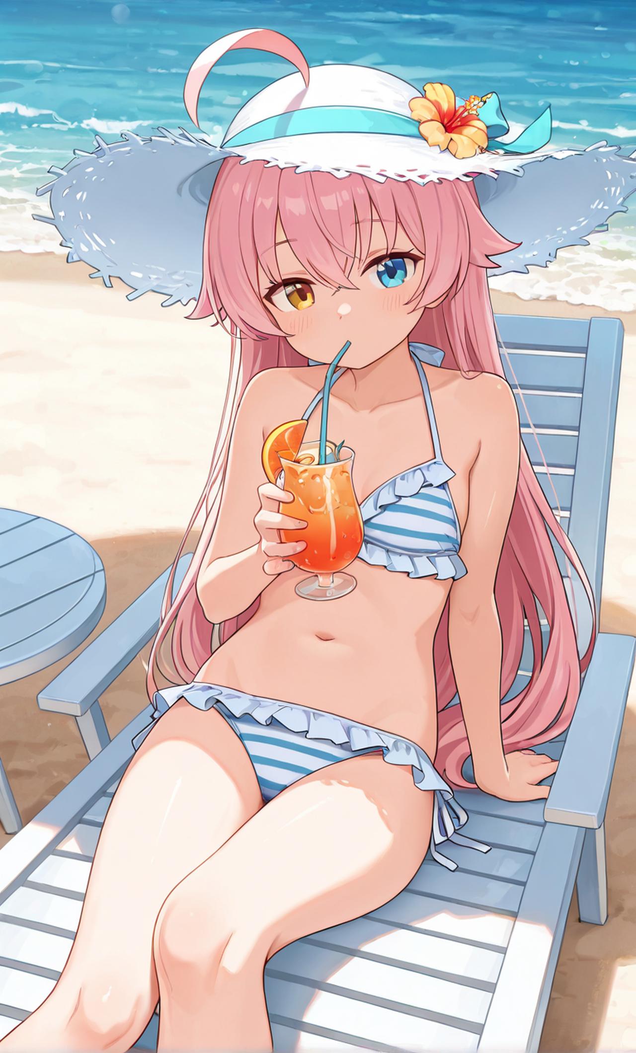 穿着可愛的比基尼,戴着墨鏡,靜靜地躺在沙灘椅上,即使陽光明媚也不願意下水,似乎有些心事