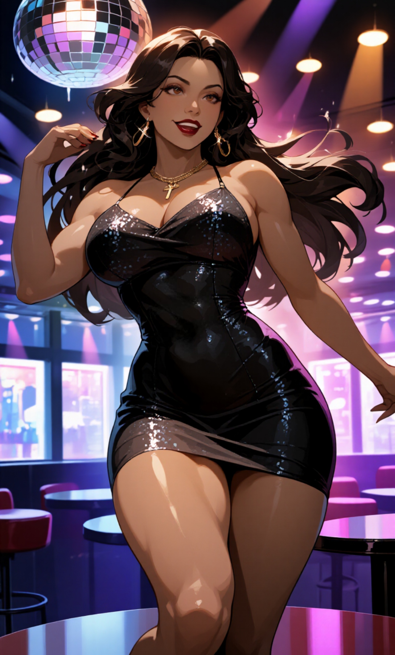 The disco lights scatter across the room as she dances on the table, her black glittering dress catching every flash of color. Each movement is confident and deliberate—hips rolling to the beat, hair flowing down her back like liquid shadow. She doesn’t rush. She owns the rhythm. Then, in the middle of a turn, her eyes find you. It’s subtle at first—a lingering glance, a half-smile forming beneath dark red lips. Her expressive brown eyes hold yours a moment longer than chance would allow. The crowd fades. The music feels louder, closer. She tilts her head slightly, as if confirming what she already knows: you’re watching, and she’s letting you. She keeps dancing, but now it’s different. Her movements slow, more intentional, each step angled so you can see the curve of her hips, the confidence in her posture. A gold cross at her neck glints as she leans forward, one hand lifting, the other steadying her balance on the table. She doesn’t wave. She doesn’t beckon. She simply smiles—warm, knowing, inviting—before turning back into the lights, leaving you with the unmistakable feeling that the next move is yours.
