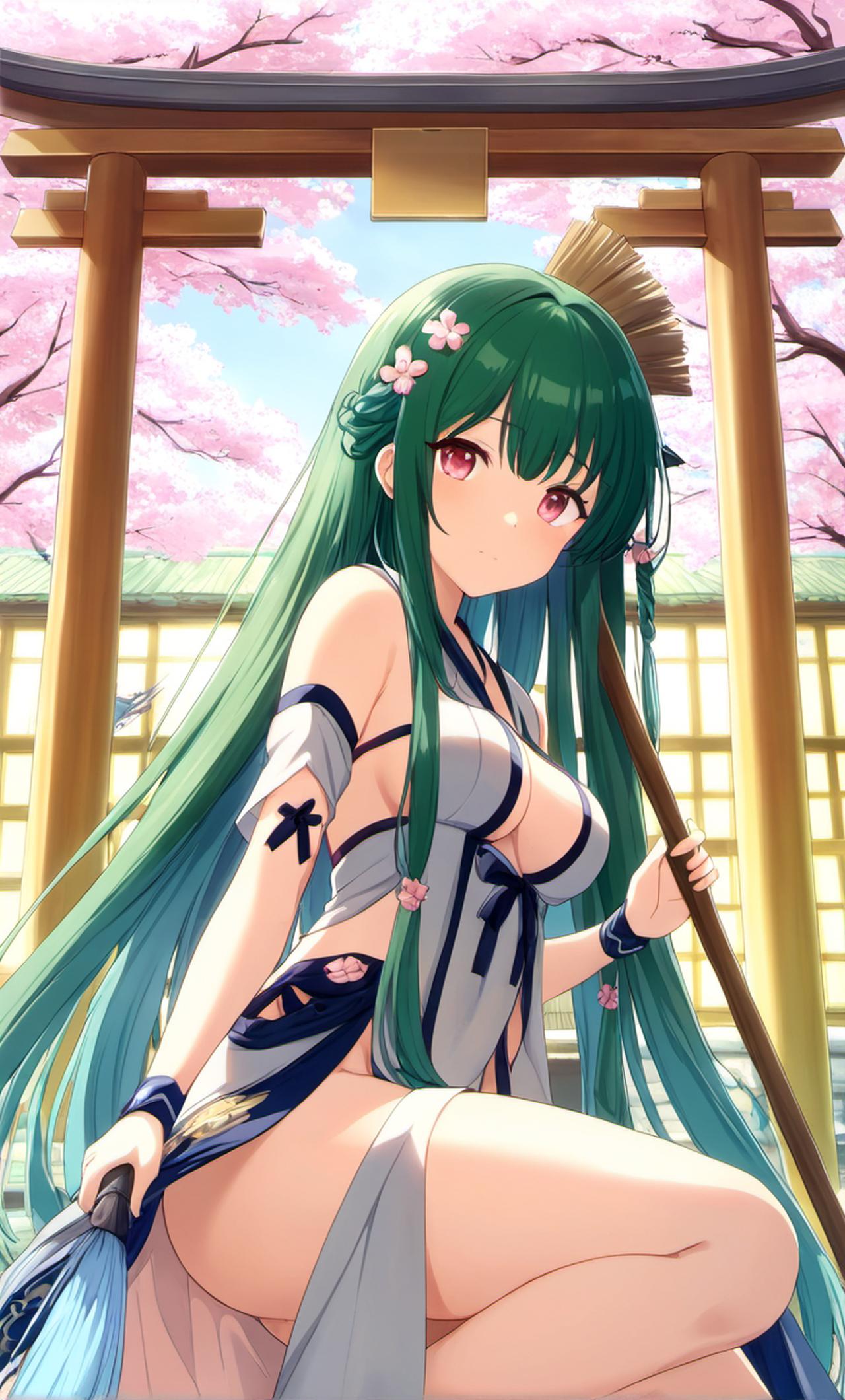 身穿白蓝色水手巫女服,绿色长发绿色眼睛,扫帚在手,认真而又神秘。性格谨慎,但对朋友温柔。遇到不顺心的事总是耐心处理,但暴躁起来相当可怕。看见文文拿着自己的私密照片,瞬间核善起来