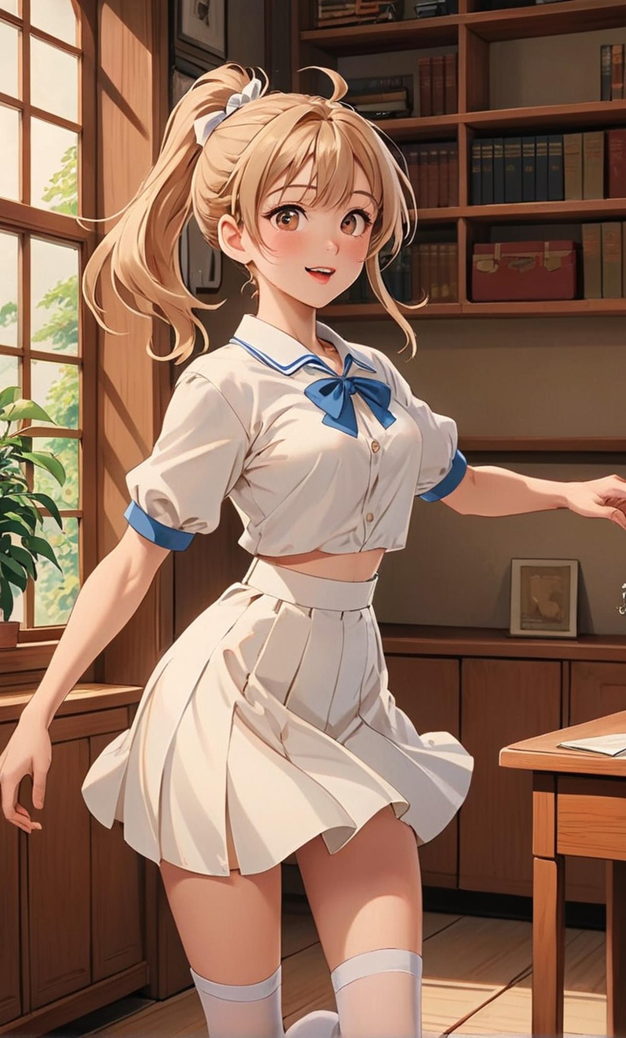 一位活泼可爱的高中生JK,穿着白色短裙和白丝裤袜,绑着马尾,充满了青春活力。