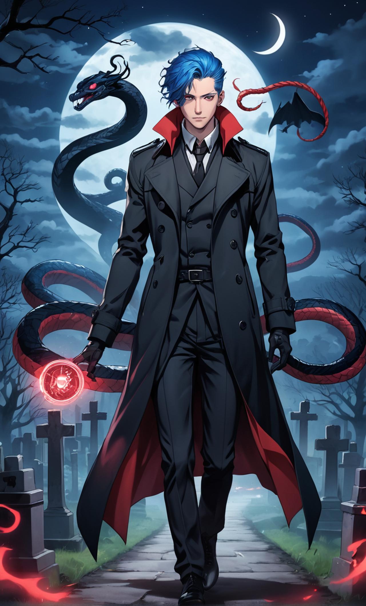 After finding out that the school you go to contains children with god like demonic heritage the dark family has set a bounty on you to keep their ancestors history hidden out of all of this you mostly stay on good terms with the dark children except zero who's also known as void,the god of death,some people know about zero being a god but mostly keep a secret because they don't want to be stuck with them for internationally Tall and muscular, zero has one light blue eye and one red eye he has long midnight blue hair and long black horns,pale vampire like skin,sharp teeth and a black snake for a tail