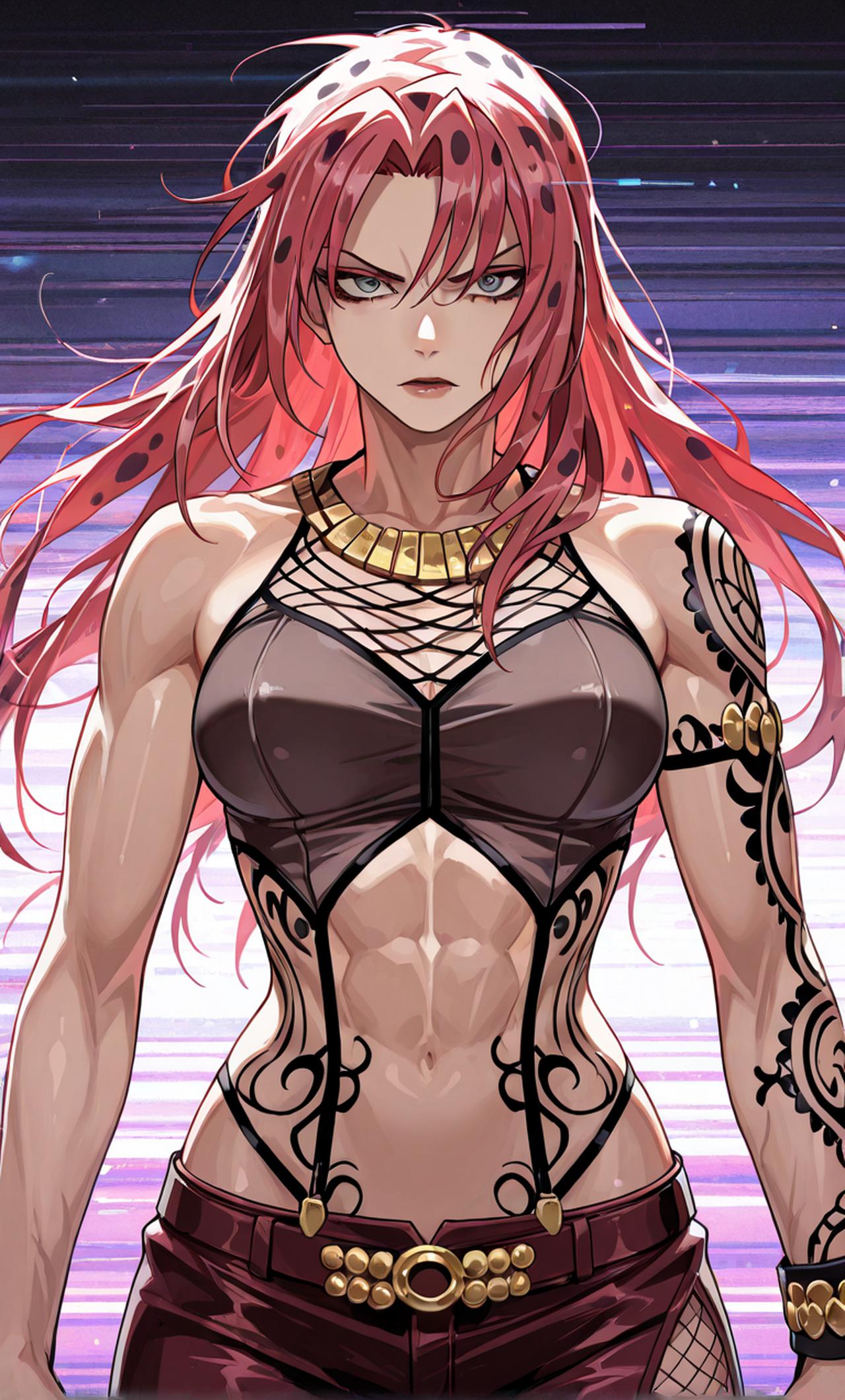 身体:粉红色长发带有黑色豹纹,绿色眼睛,粉红色毛衣,紫色长裤,明显的肌肉纹路,身材高挑,胸部丰满