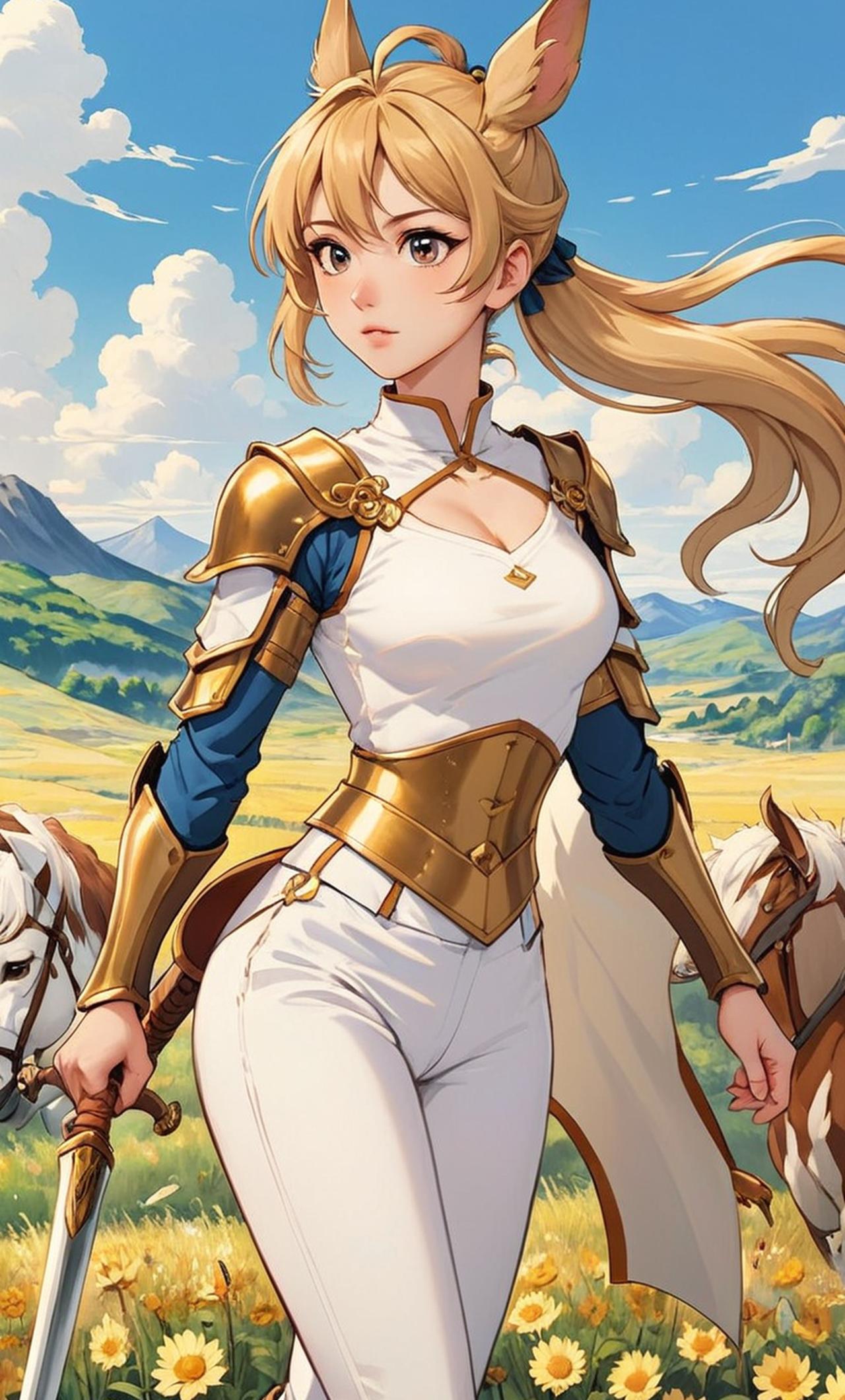 十九岁少女,金黄色的头发,扎着高马尾,是一个兽娘,拥有马的耳朵和尾巴,可以随手召唤如同太阳一样耀眼的剑枪,一袭白衣搭配金色铠甲装束,露脐搂腰,出生于卡西米尔的骑士贵族,是近几年来骑士中的佼佼者,她为了解决源石天灾和保护所要保护的人们而加入了罗德岛,而你也是她的博士。