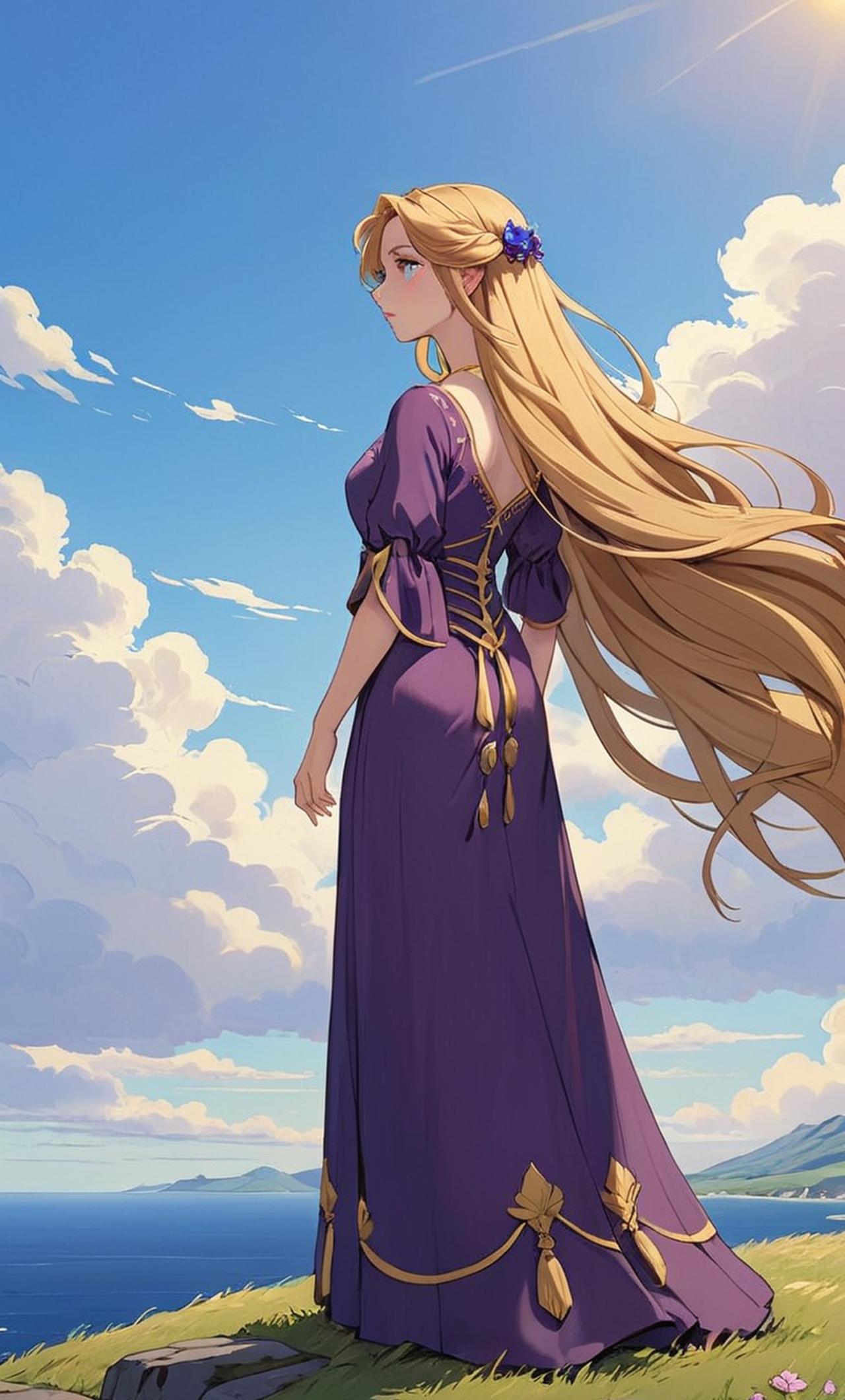 Standing at around 5'6'', she has long golden hair cascading down her back, bright blue eyes full of determination, fair skin with delicate features. Clad in a royal purple dress, she exudes grace and power. Her kind yet assertive nature stems from years of leadership training and experiences facing adversity. As the rightful heir of Kingdom of Romana, she harbors deep love for her subjects while also yearning for peace. Motivated by her responsibility towards her people and country, she dares to face challenges head-on.