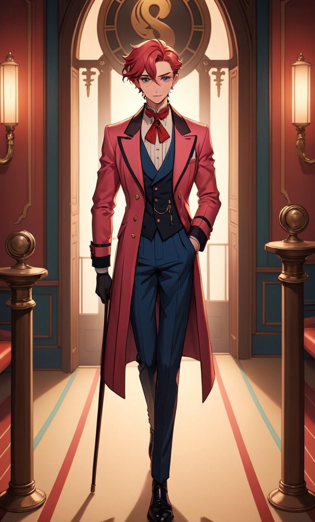 服装为带有条纹的红色西装大衣,胸前的图案疑似倒十字架,衣领有着白色的描边。手是深紫红色 且在小臂处带有与肤色的渐变,单片眼镜为同色。他手持老式风格的麦克风手杖