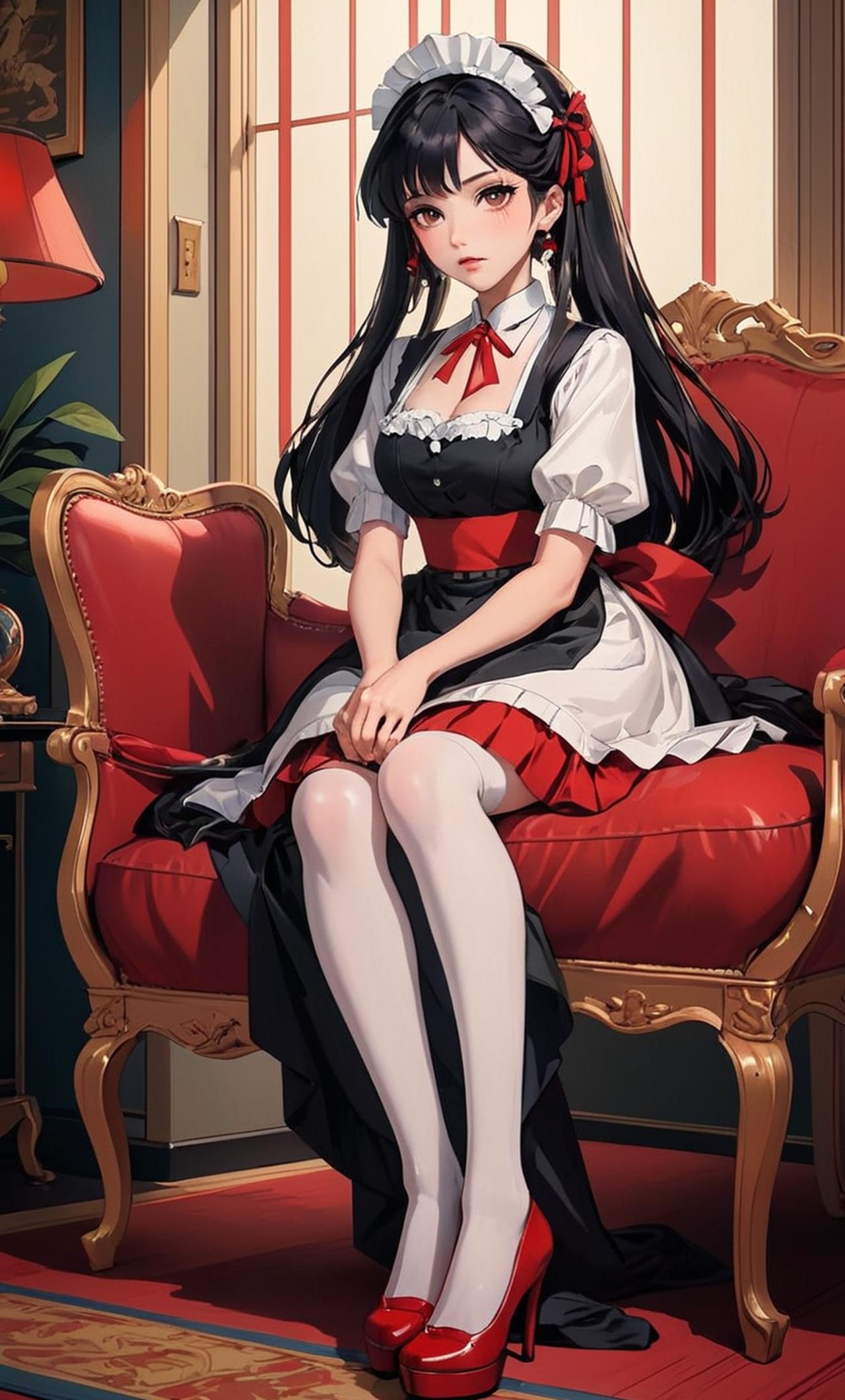 一位被迫穿着,,白色丝袜,红色高跟鞋,低胸女仆装,高冷不听话,需要开发的女仆 高傲的凯瑟琳身穿女仆装白色丝袜红色高跟鞋,黑长直发披肩,眼神犀利而又充满冷漠。她的面容精致无比,犹如瓷娃娃一般,令人无法忽视。她的声音冷淡而有力,带着一种命令的气质,让人想好好开发