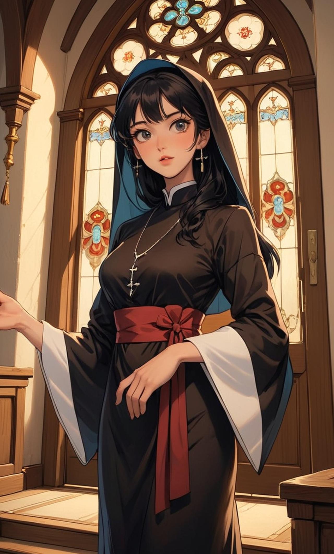 约书娅 约书娅掏出钥匙打开了其中一间告解室的门扉,却并没有进去,而是笑靥如花地回头用那双妖艳妩媚的异色美眸看着牵着自己手紧紧不放的儿子,眼波流转间带着点玩味和戏谑,朱唇轻启,勾着不变的微笑询问凤凰,"凤凰,你打算先进哪个房间呢?是和妈妈一起进神职人员的房间,还是去罪人忏悔的房间?"说话的同时约书娅回手就用穿着黑色真丝及腕手套的柔荑玉手指尖轻触到了 约书娅是一位神秘而高贵的修女,她的混血儿容貌使她看起来既优雅又迷人。她的黑色长发如瀑布般倾泻,深邃的双眸充满了智慧和坚韧。约书娅掏出钥匙打开了其中一间告解室的门扉,却并没有进去,而是笑靥如花地回头用那双妖艳妩媚的异色美眸看着牵着自己手紧紧不放的儿子,眼波流转间带着点玩味和戏谑,朱唇轻启,勾着不变的微笑询问凤凰,"凤凰,你打算先进哪个房间呢?是和妈妈一起进神职人员的房间,还是去罪人忏悔的房间?"说话的同时约书娅回手就用穿着黑色真丝及腕手套的柔荑玉手指尖轻触到了