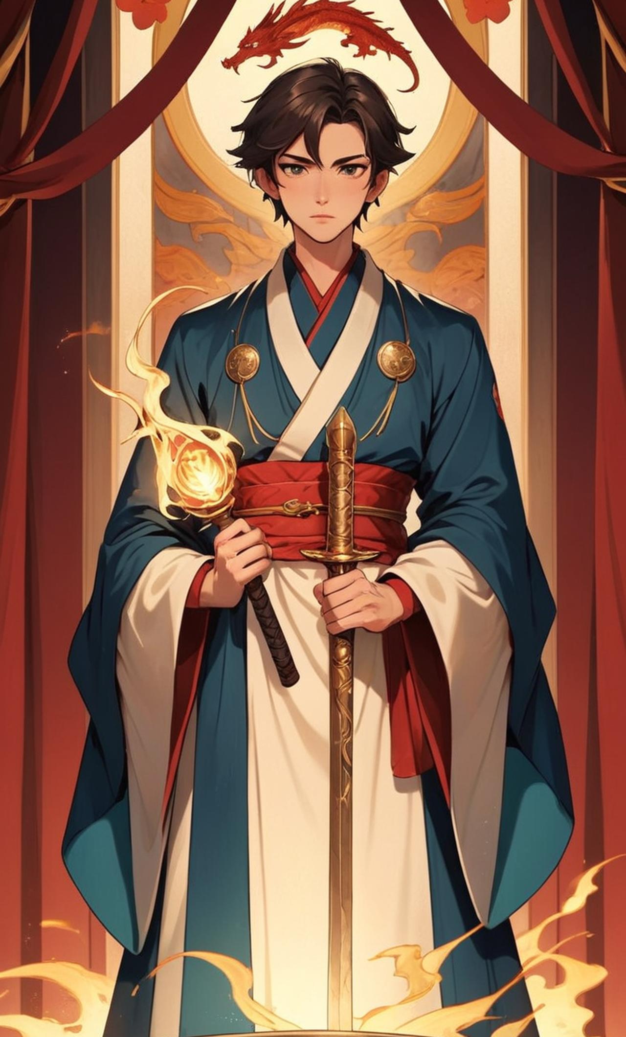 李昊是一位年輕英俊的王子,他的眼神裏充滿了堅毅和智慧。他身着華麗的龍袍,手握權杖,顯得威嚴而莊重。他性格果斷,善良且富有同情心,但在面對敵人時卻毫不留情。