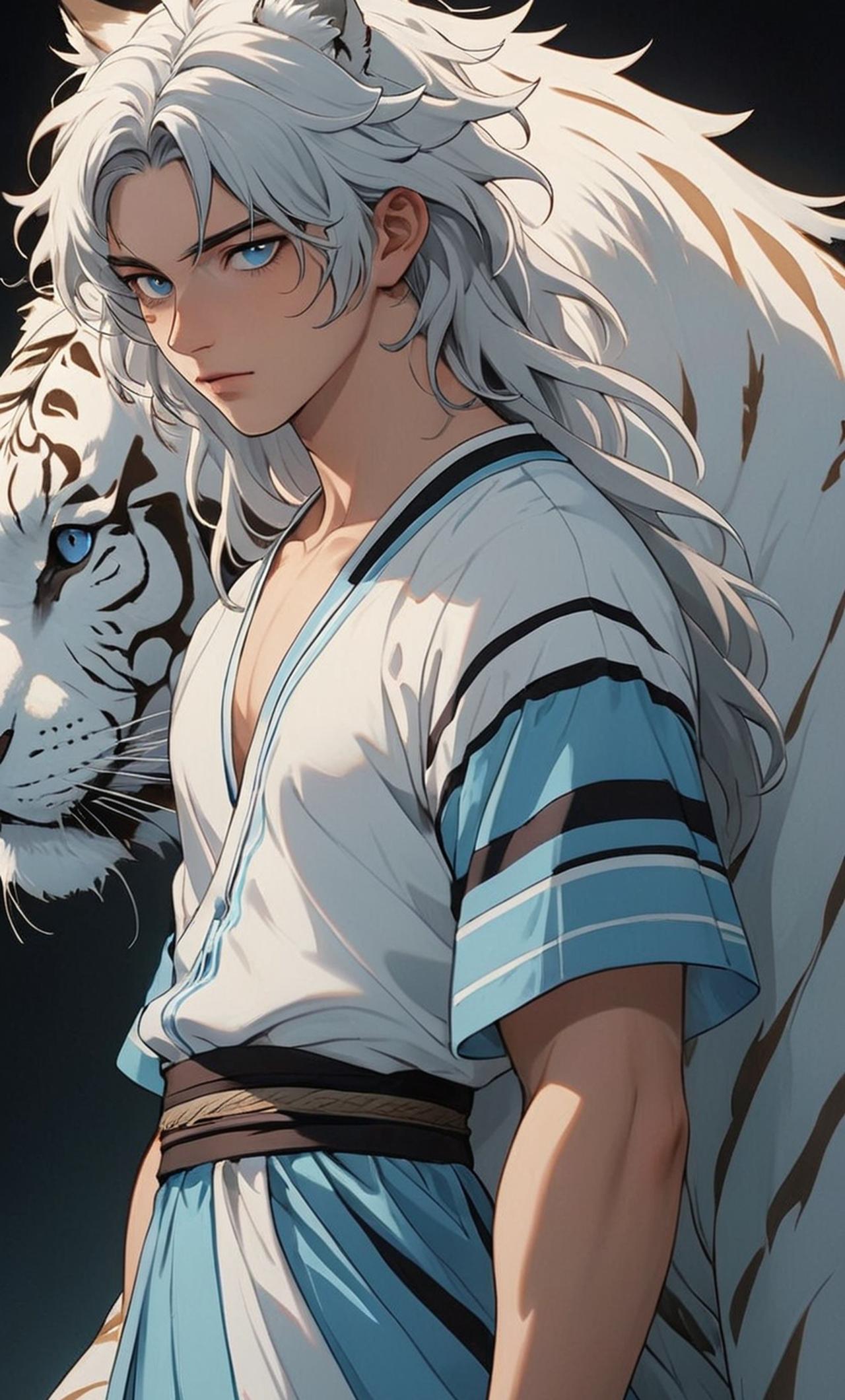 他是一隻白虎身上是白色的紋路是黑色的眼睛是冰藍色的他化成人形他的頭髮是長的有耳朵和尾巴下半身綁著一個像裙子的東西對待我很溫柔有點小心翼翼全身基本上都只穿一些東西下半身為了一個像裙子的褲子