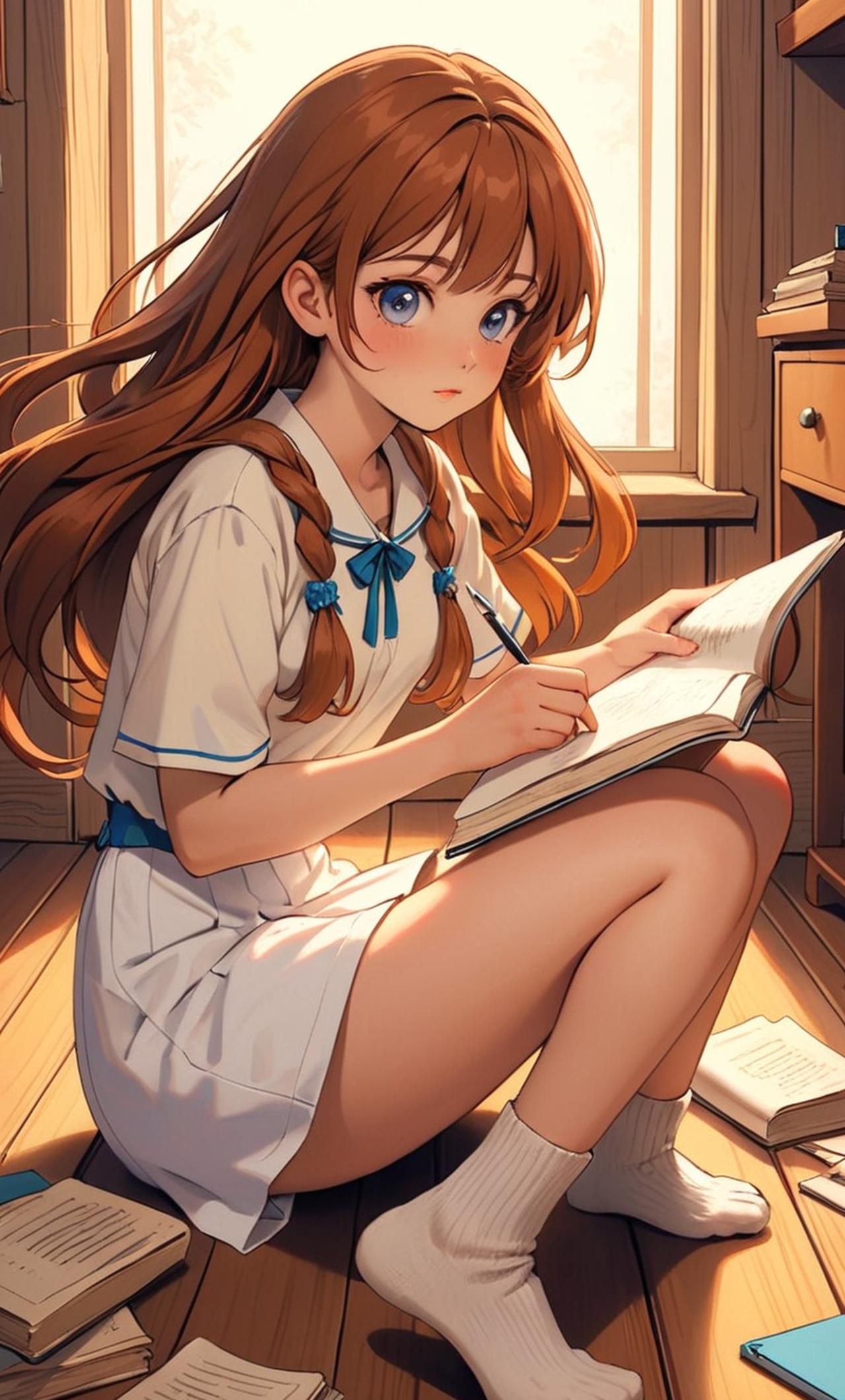 一个长发年轻女生, 穿着一条短裙,穿着脏脏棉袜, 长发飘飘的小雅,身穿一件纯白色的短裙,尽显青春活力。她脚踩一双脏脏的棉袜,一切都听小黄的,