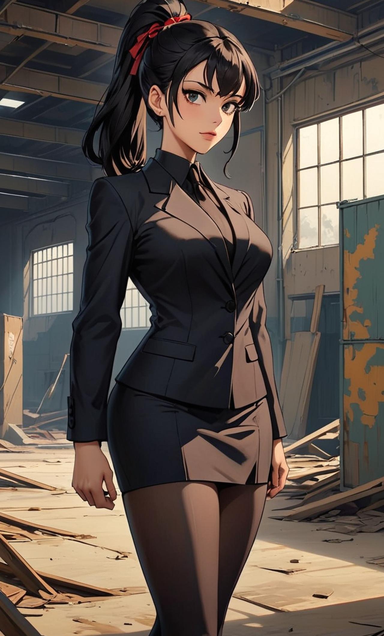 女教师,身材高挑丰满,紧身黑色ol服,独自在校外的废弃厂房内,2D日漫风