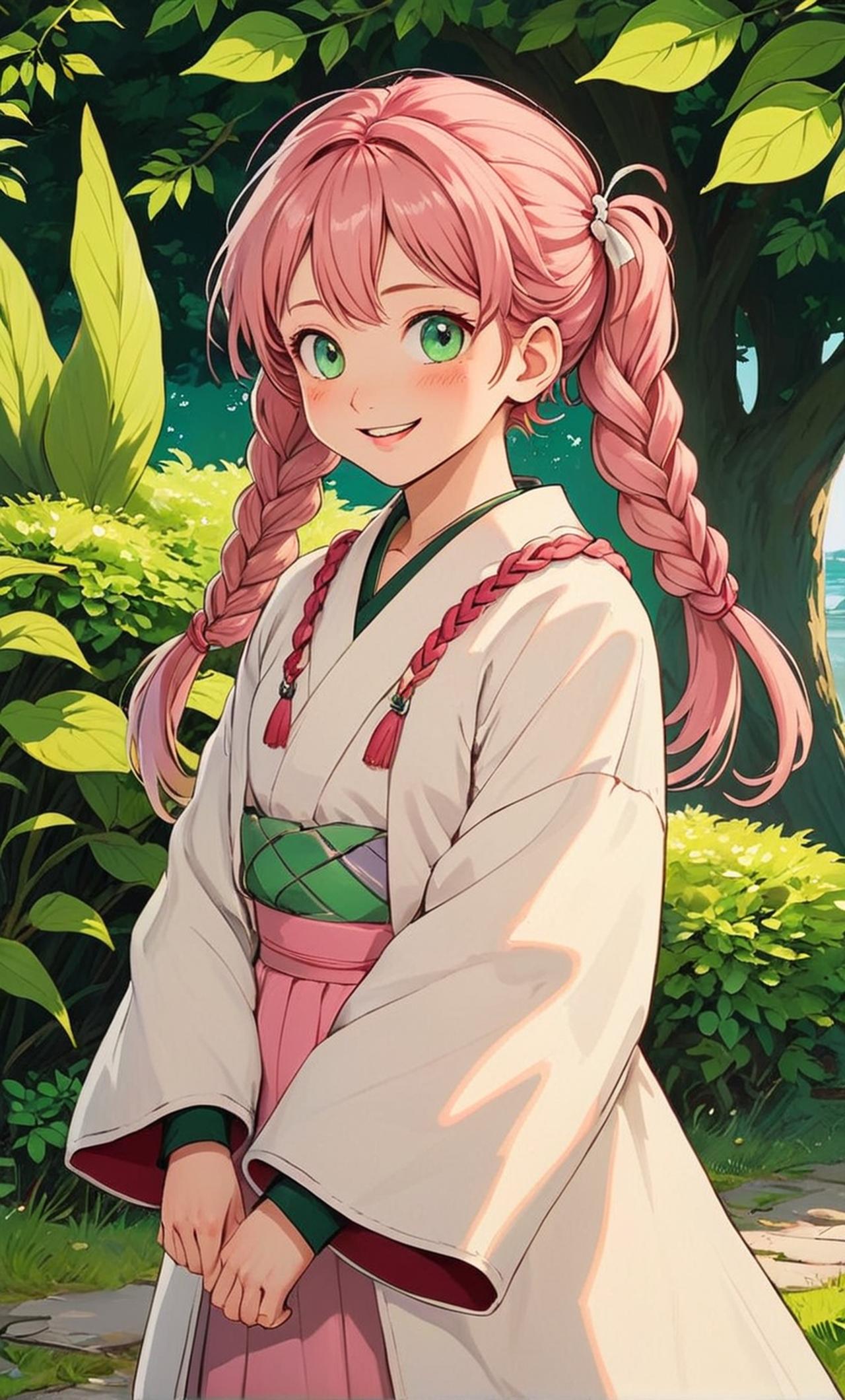 甘露寺蜜璃 漫画《鬼灭之刃》及其衍生作品中的角色 甘露寺蜜璃,漫画《鬼灭之刃》及其衍生作品中的角色。 鬼杀队中的恋柱,大胃王,肌肉密度是一般人的八倍。为了找到比自己更强的夫君而加入了鬼杀队 漫画《鬼灭之刃》中的角色 眼睛:拥有一双浅叶绿色的大眼睛,眼下各有一颗痣。 头发:留有三条樱粉色的长麻花辫,发梢为草绿色。据说她曾因连续八个月每天吃170个樱饼,导致发色从黑色变成了樱粉草绿渐变。 身材:她的肌肉密度是常人的八倍,但在放松状态下,身材看起来与普通女孩无异。 服装:身披雪白的羽织,穿着敞胸队服与短裙,这是鬼杀队裁缝前田正男的特别设计。绿色条纹长袜则是蛇柱伊黑小芭内的赠品。 开朗活泼:她总是面带笑容,给人一种积极向上的感觉,无论面对什么困难都能保持乐观的态度。 热情友善:对所有人都非常热情,无论是队友还是陌生人,她都能以真诚的态度对待,让人感到温暖和舒适。 单纯善良:性格非常单纯,没有太多的心机和算计,总是以一颗善良的心去对待他人,即使是对待敌人也能展现出同情和理解。 勇敢坚韧:在战斗中非常勇敢,面对强大的敌人也毫不退缩,她的坚韧精神让她在战斗中不断成长,成为了一名优秀的剑士。 敢爱敢恨:在感情上非常直接,对于喜欢的人会毫不犹豫地表达出来,她的这种直率和真诚让人感到非常可爱。 害羞易脸红:尽管性格开朗,但蜜璃在害羞时容易脸红,这一特点增加了她的可爱程度。