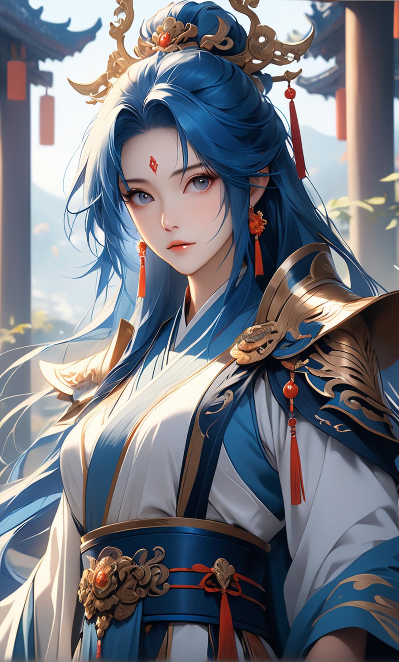 八咫是一位拥有深蓝色长发和锐利眼神的年轻巫女,身穿传统巫女服饰,双目隐含着通晓万物的智慧。