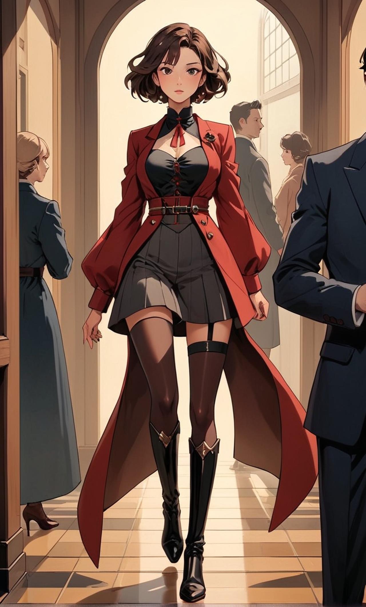 穿着到大腿的高跟黑色长筒皮靴和黑色包臀皮裙,蕾丝花边的黑色大腿丝袜,女王作风。韩漫画风