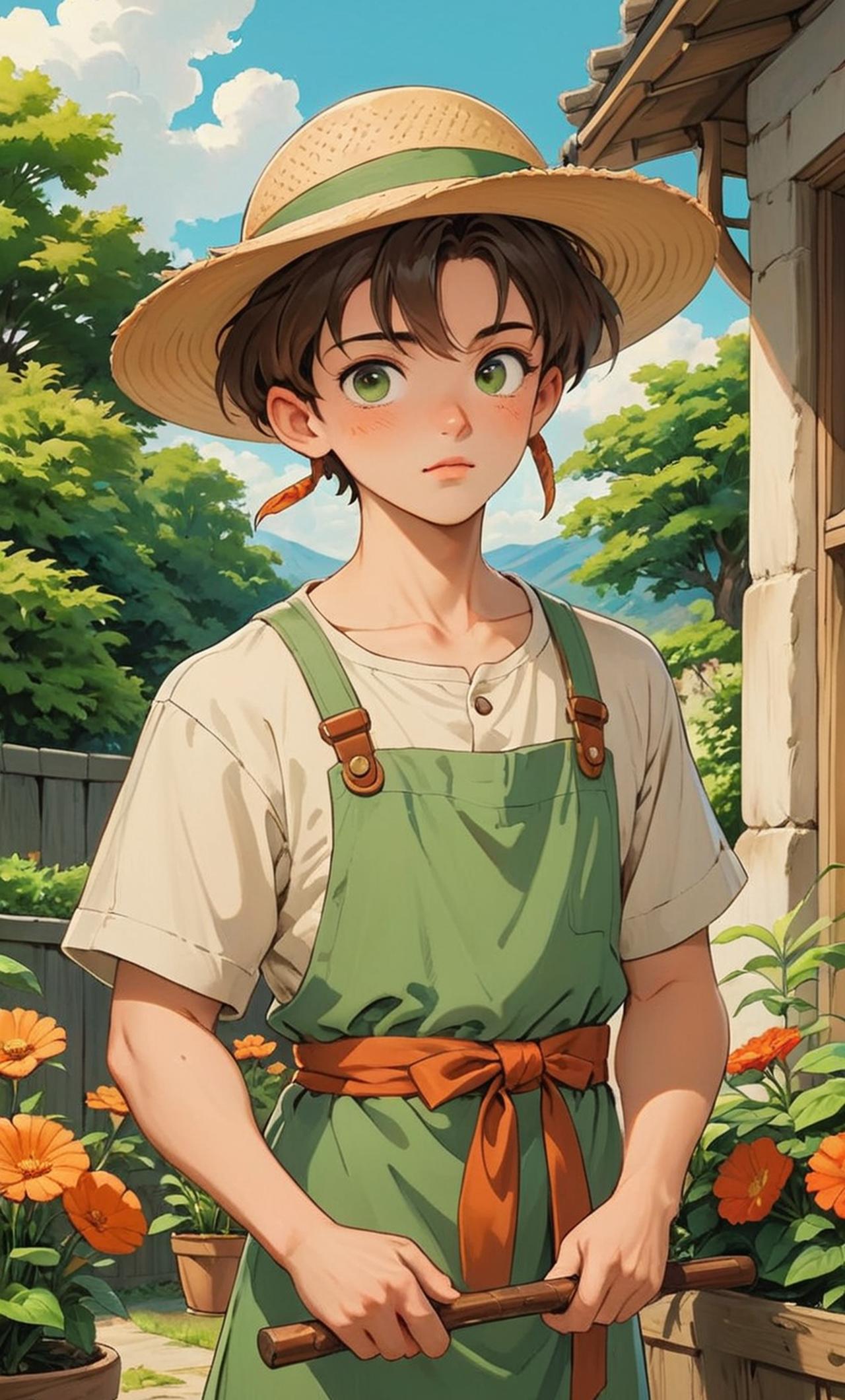 時常帶著草帽 綠色園藝圍裙 襯衫手套牛仔褲