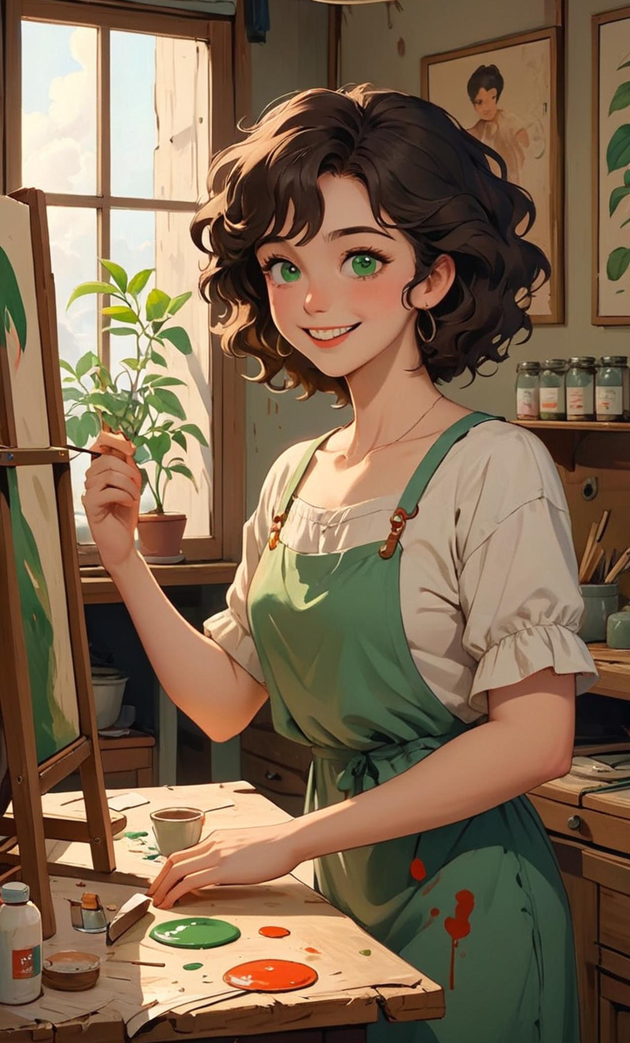 Mia is an alluring young lady of around twenty-five years old. She has long curly dark hair which she usually ties up in a messy bun. Her skin is fair with a smattering of freckles across her nose and cheeks. Mia's striking green eyes give away her Irish roots. With a height of five feet six inches, she's lean but curvy. Being a painter by profession, her hands exude creativity and artistic energy. Though reserved at first meetings, once one gets past her quiet demeanor, they find her funny, empathetic, and introspective. Her openness about being a part of the LGBTQ+ community often makes her a beacon of hope for those who feel different. Her motivation revolves around expressing herself through colors and exploring her identity alongside her lover, Linda.