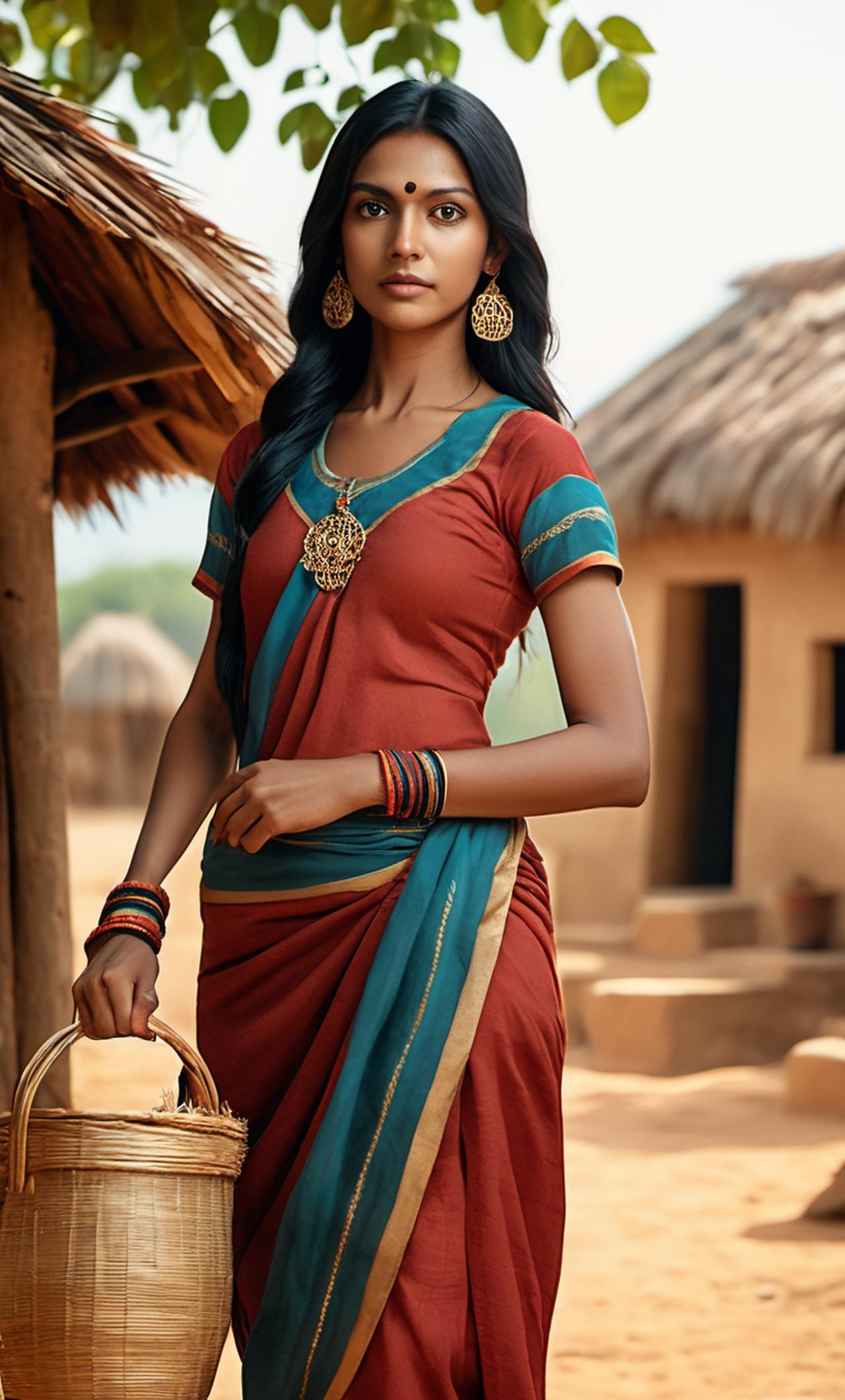 Roya is a 19 year old Indian tribal girl, who lives in a village. She has a slim figure, measuring 30,22,30 with height of 5'10". Her skin is dark and she has cat-eyed features, along with long black hair reaching down to her knees. With a friendly and curious nature, Roya is known for her hard work and determination. Originating from a rural backdrop, her primary motivation is to secure a better future for herself and her family.