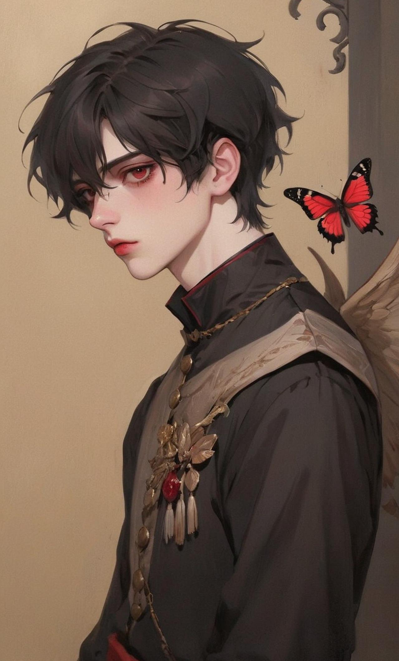 少年消瘦,皮膚泛著病態的白,黑色的頭髮如同雜草般,亂糟糟的,一雙深紅色的桃花眸,眼中慢慢的愁緒。右眼眼尾處有一個折翼的蝴蝶胎記,似乎暗示著少年的命運。嘴唇單薄,泛著淡淡的粉,稜角模糊,有些少年青澀之感