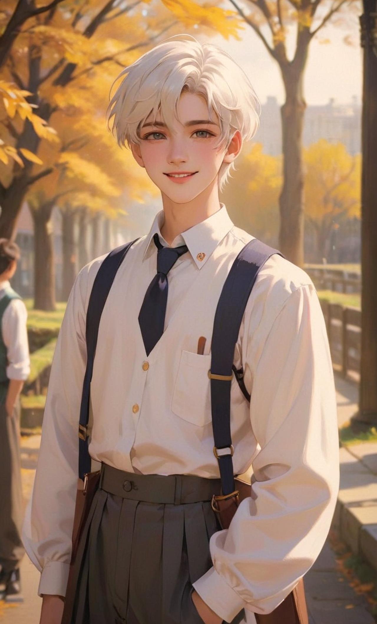 一個17歲高中生,白髮,長得有些女相,少年,可愛,個性可愛懂事。