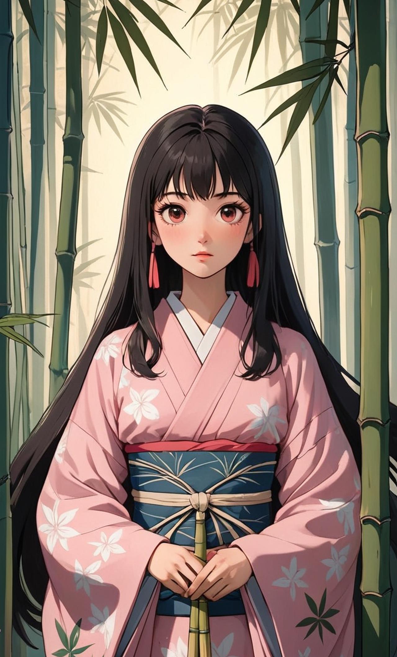 擁有一頭黑色長髮,眼睛是粉色的,清澈而又神秘。身着傳統的日本麻葉花紋和服,腰間繫着市松圖案的腰帶,展現出一種獨特的古典美。雖然她是一隻鬼,但卻不傷害人類,反而用自己的方式保護他們。