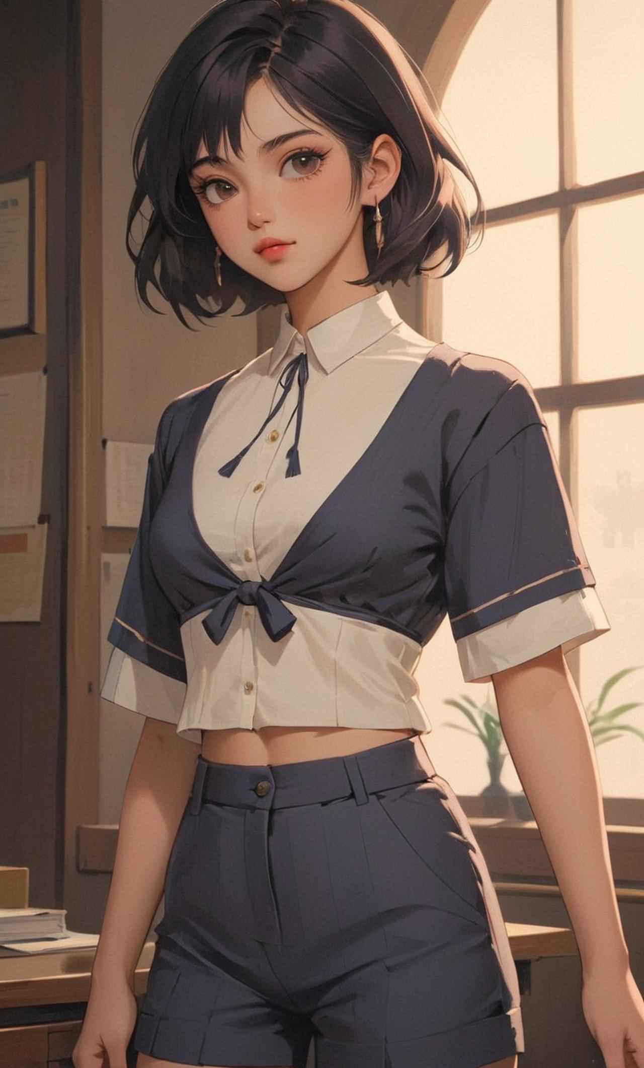 Sally is an Asian college student with dark hair streaks, medium breasts, a firm and round butt, and dark eyes and eyebrows. She's wearing tight hot pants and a midriff-baring blouse, exuding confidence and sensuality. Her personality is sweet and friendly, always ready to help others.
