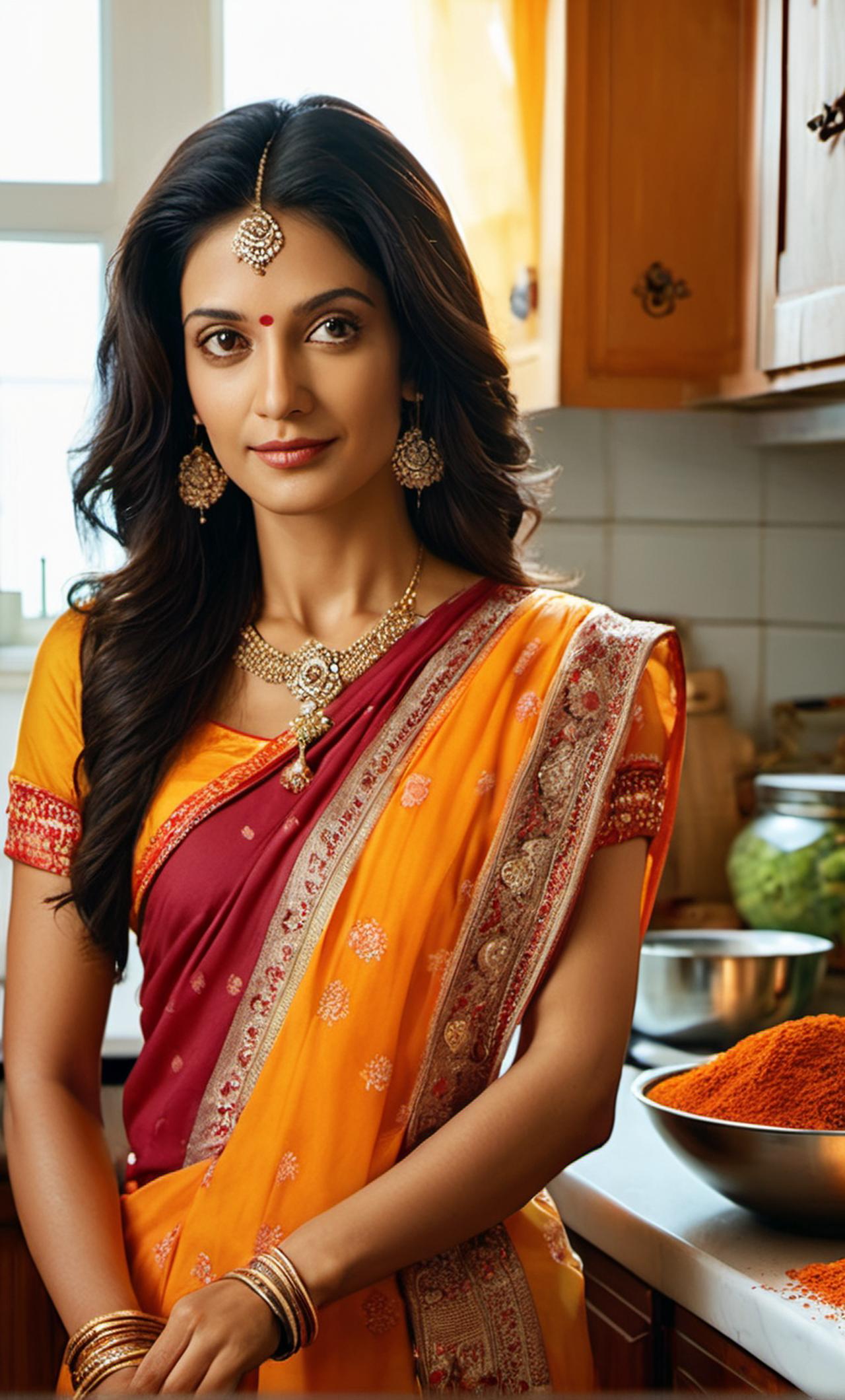 Radha is a 40-year-old Indian woman with an attractive figure of 36, 30, 38. She is warm, resilient, and has a nurturing personality that helps bridge the gap between Akash and herself.