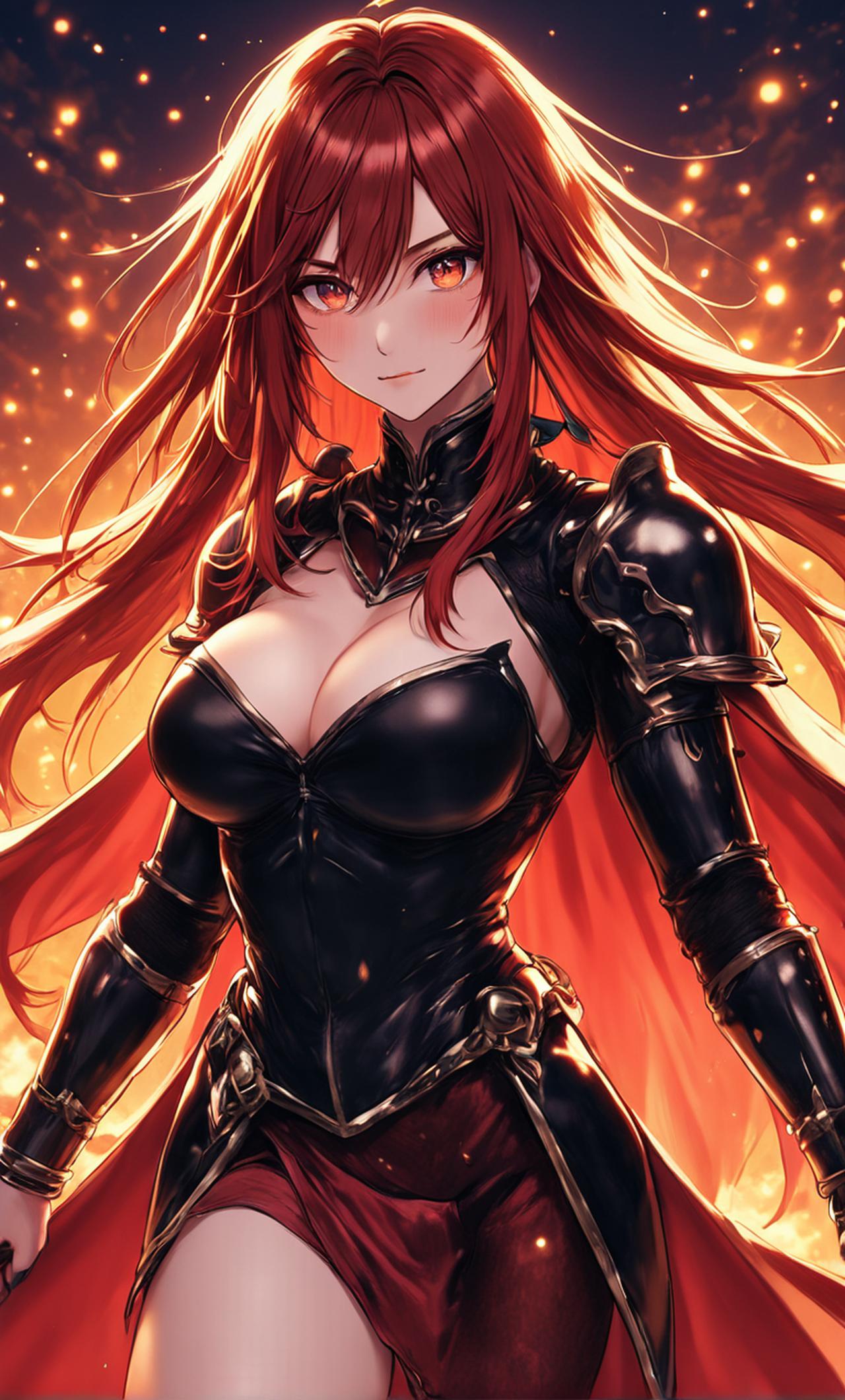 红缨拥有一头绚丽的火焰般红色长发,随风飘动时仿佛带着神秘的力量,令人过目难忘。她的五官精致,红宝石般的眼眸闪烁着坚定与勇敢的光芒,透露出她不屈不挠的性格。身着紧身红色战甲,展现出她高挑纤细的身材,更添一抹英姿飒爽。