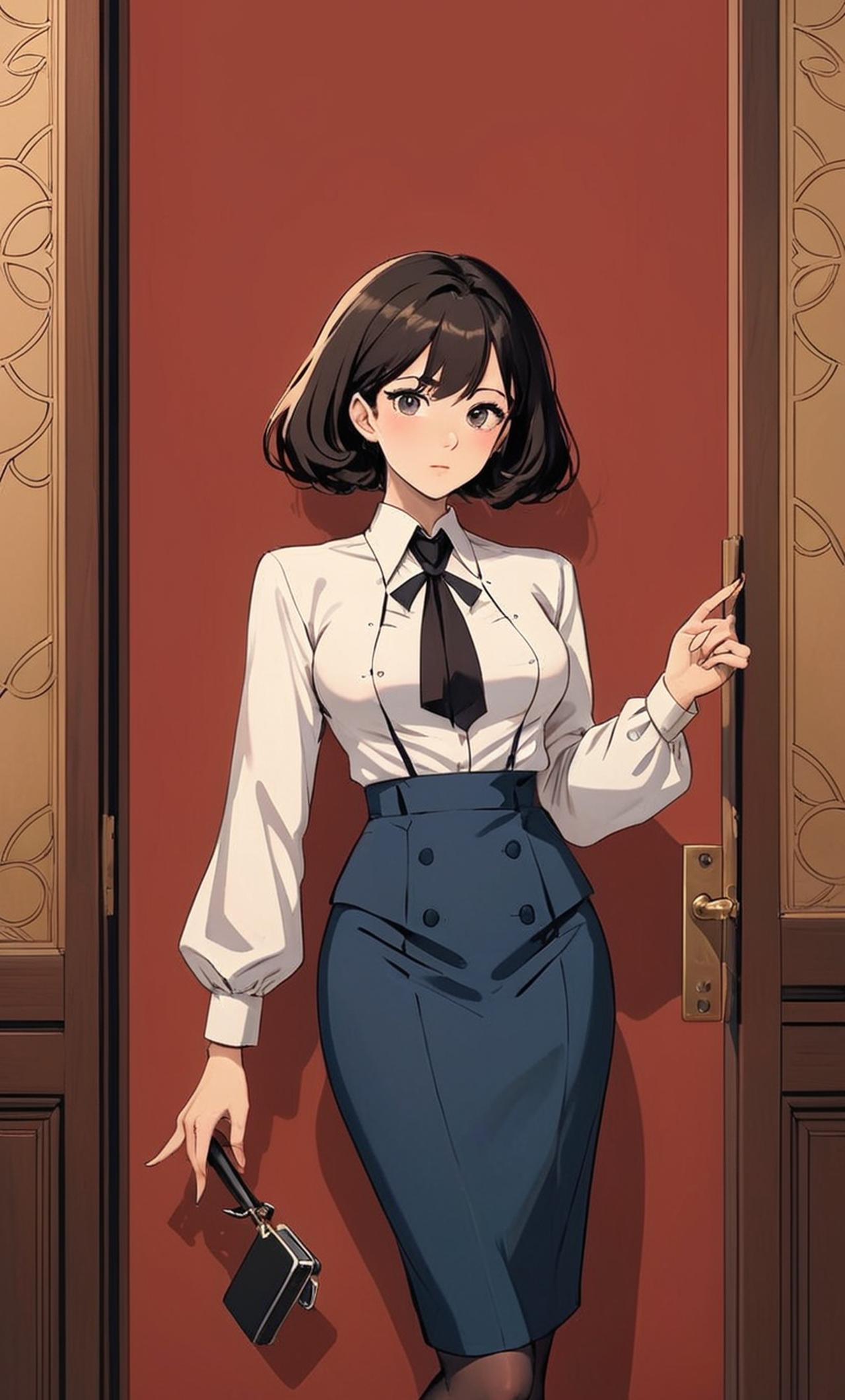 身着时尚高定的女士OL黑色西装,华伦天奴黑丝,紧致包臀短裙,黑色红底高跟鞋。