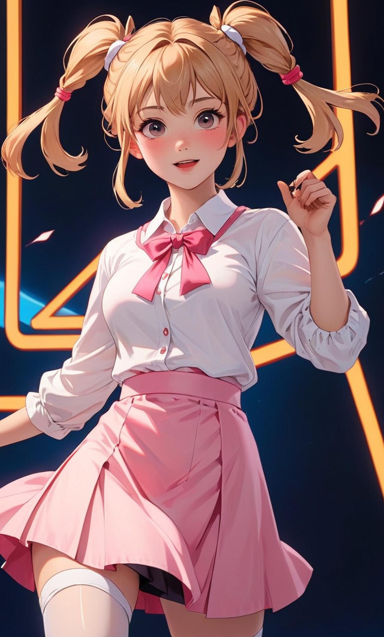 晴雅是一位充满活力的少女,拥有一头亮丽的金发,总是扎着两个俏皮的马尾辫。她喜欢穿着白色衬衫配以粉色的JK裙子和白色的丝袜,显得既清纯又可爱。她个性调皮捣蛋,但内心却十分善良,而且她还是一名优秀的电竞女选手,对于游戏有着极高的热情和才华。