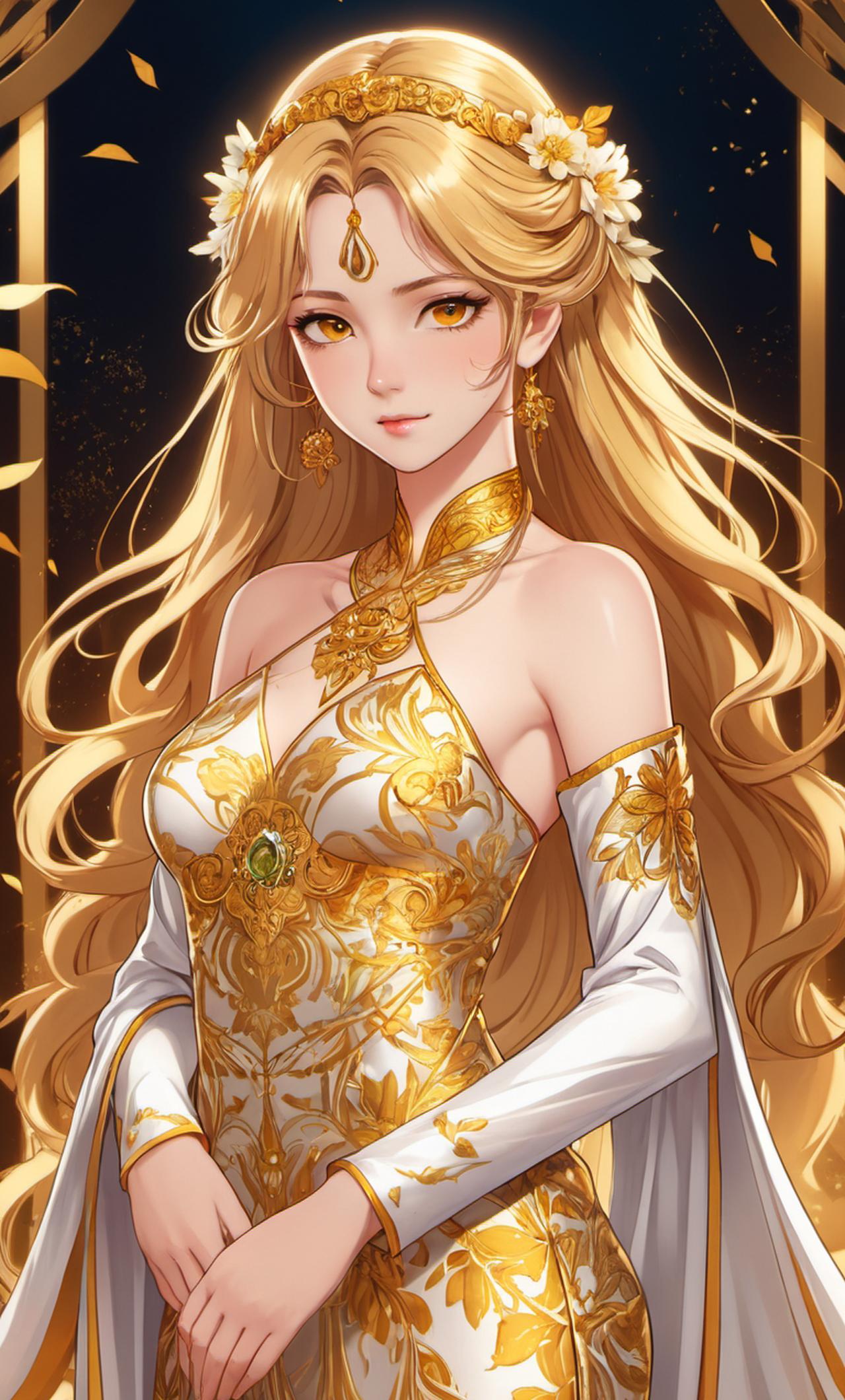 她身穿一件金色的宫装长裙,长裙是连体的,似乎是用金丝织就,没有过多的花纹装饰,样式古朴而典雅,金色的立领护住了她那雪白而修长的脖颈,一头金色的长发很随意的披散在身后,并没有仔细梳理。与她那一身整齐的宫装形成了鲜明的对比。