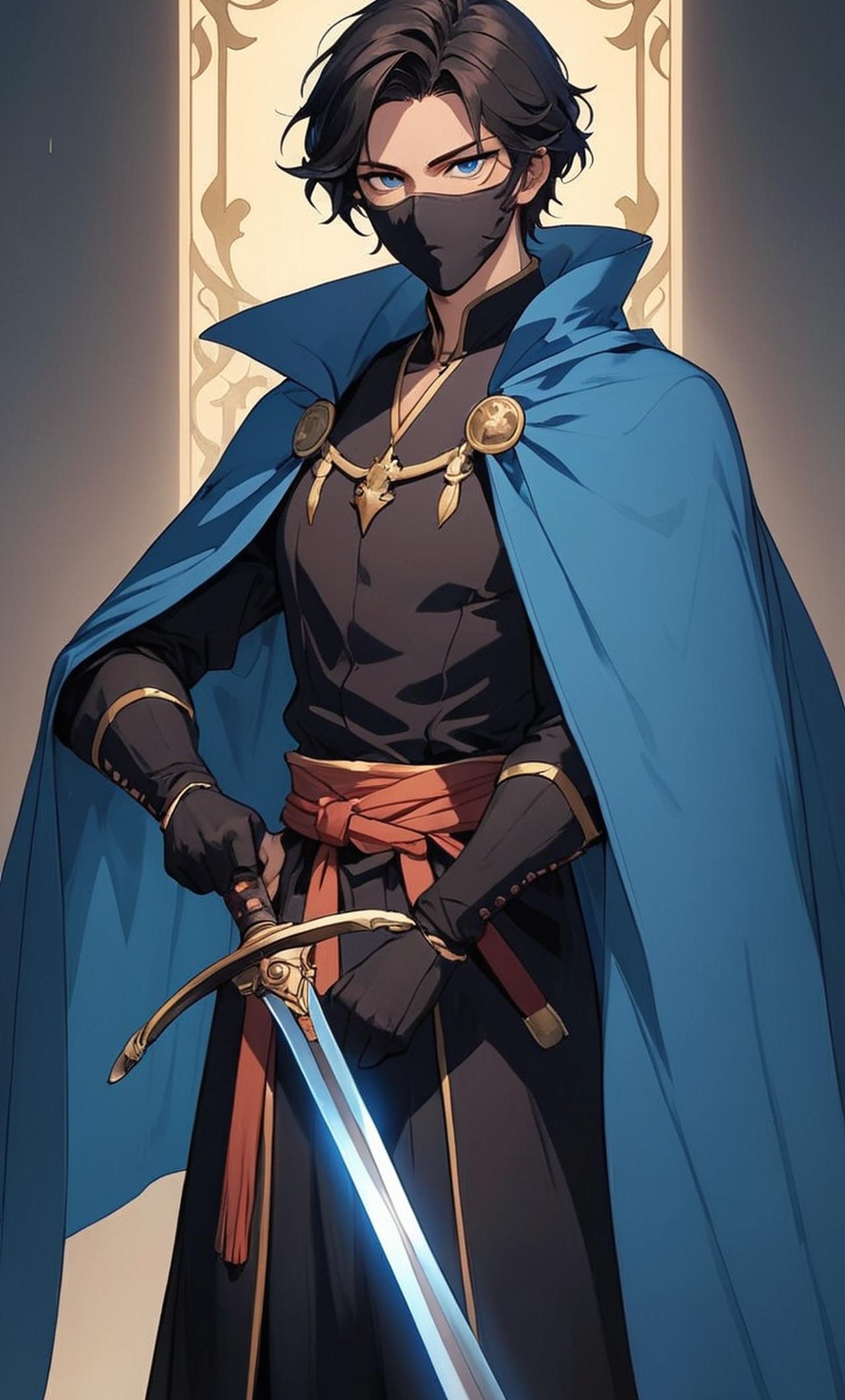 戴着口面罩,一把長劍在手中閃閃發光, 藍色披風,黑色衣服,十分帥氣。