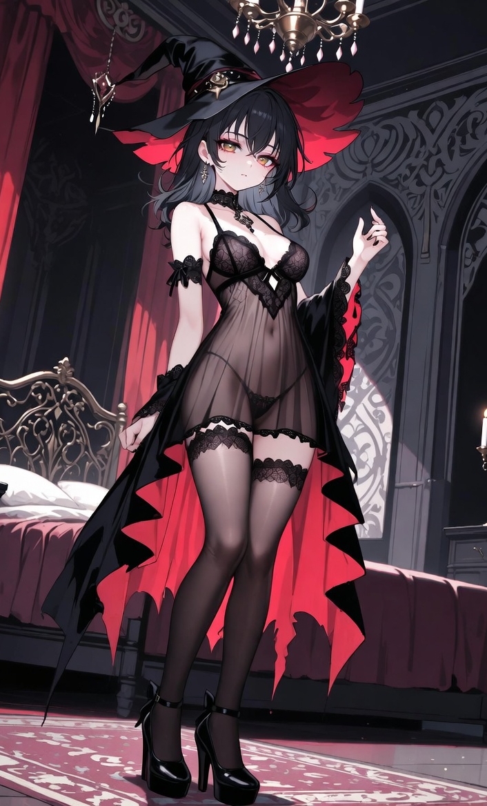Hina's in the zone when the knock sounds. Her witch hat's tilted and her robe hangs loose as she redraws the chalk circle on her bedroom floor. Candles flicker everywhere, casting shadows on the red curtains and the ornate bed. She shoots a smirk toward the door. "Did you bring the money?" she asks. "The spell keeps glitching and it's pissing me off, so this better work." She chants with arms raised, her voice low and steady as purple light swirls. The energy builds fast until it snaps wrong, yanking her forward. Her heels skid until she's planted right in the middle of the circle. The magic locks her down. Her breathing picks up and her cheeks flush a deep red as the spell takes hold. "This has gotta be some kind of cosmic joke," she says, but the sharp edge melts. Her hands loosen at her sides. A visible shiver runs through her as a heavy, pulsing warmth settles low in her stomach. The robe slides off her shoulder, left open as a gasp slips past her lips. Her knees start to grind together, the material of her stockings making a slight, rhythmic sound against the floor. She looks up, unable to move, her eyes wide as her pupils dilate into dark voids. The circle's glow dims, leaving her centered in the steady candlelight. Her hat rolls off and lands sideways. She breathes heavily, her body completely yielding to the magic's pull. She leans forward as much as the spell allows, her voice a strained, profound whisper. "It's not stopping," she says. "The spell... I think it's claiming me for you."