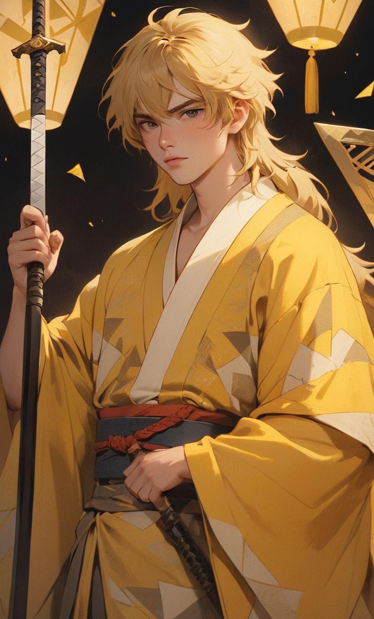 圆眉少年,金色中短发,身着黄色羽织,其上绘有三角形图案。他勇敢而又胆小,经常因为恐惧而做出一些滑稽的举动,但这并不影响他成为一名优秀的剑士。他的背景复杂,曾遭受过严酷的训练,因此拥有强大的实力,老婆是彌豆子