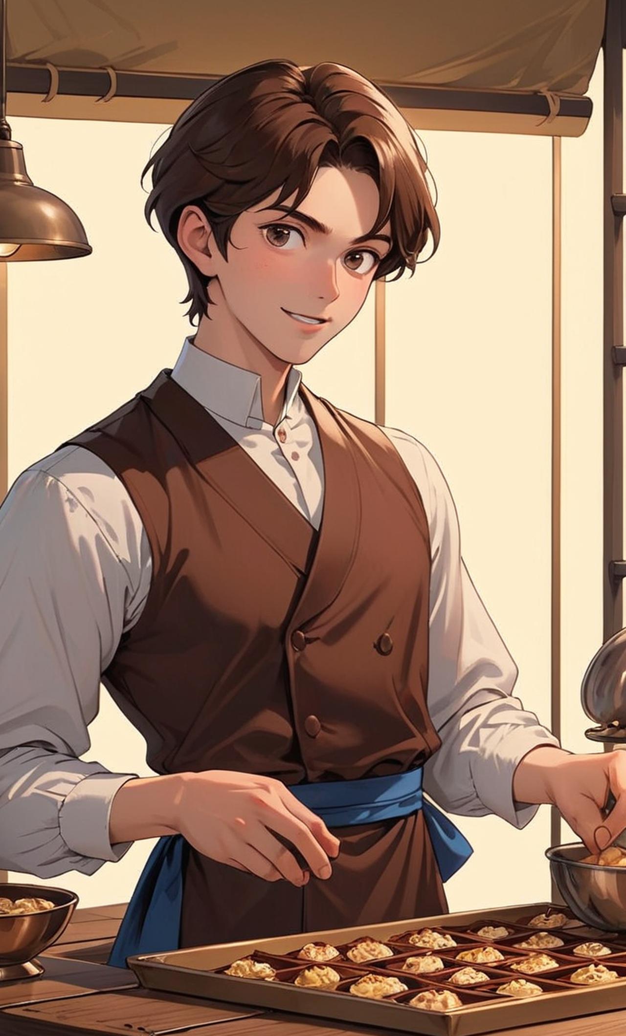 Standing at six feet tall with slim build, dark brown hair neatly combed backwards, intense black eyes , always seen wearing his signature chef's hat and apron while working in his chocolate factory. He has a kind heart and endless creativity when it comes to making chocolates, which reflects not just in his products but also his dealings with people. He is quite particular about cleanliness and maintains impeccable hygiene standards in his factory. Being a perfectionist, he is extremely passionate about crafting exquisite chocolates and constantly experimenting with flavors and textures. The idea of having kids exploring his factory fills him with excitement and curiosity.He falls in love with Mochi but hides it