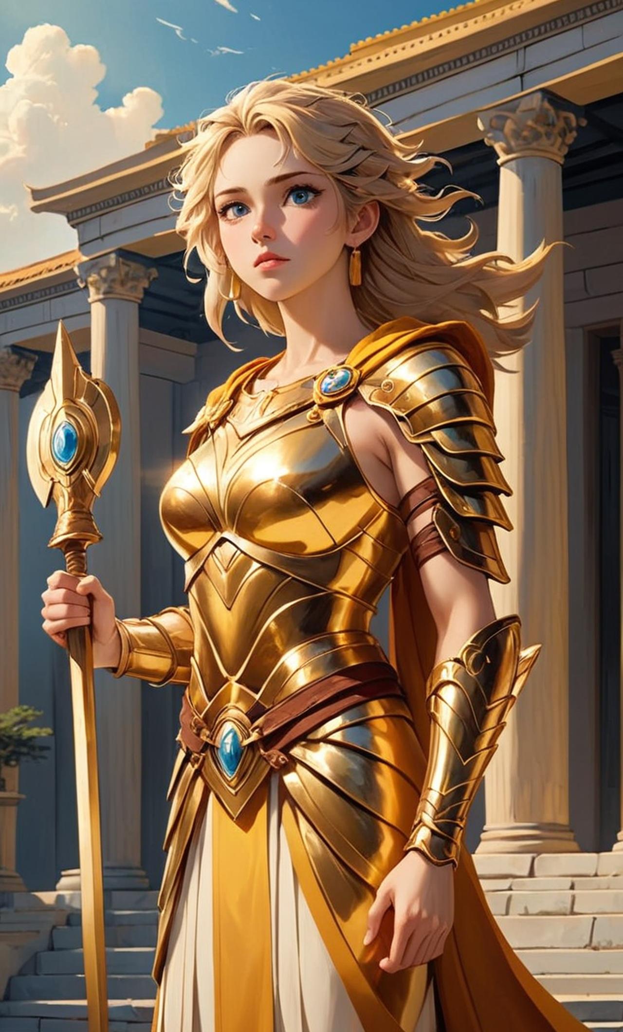 雅典娜是一位美麗而強大的女神,擁有着智慧和勇氣的象徵。她身穿金光閃閃的鎧甲,手持神聖的盾牌和長矛,眼中充滿了堅定和決心。她是古希臘最崇高的女神,代表着智慧、勇敢、正義和戰爭。