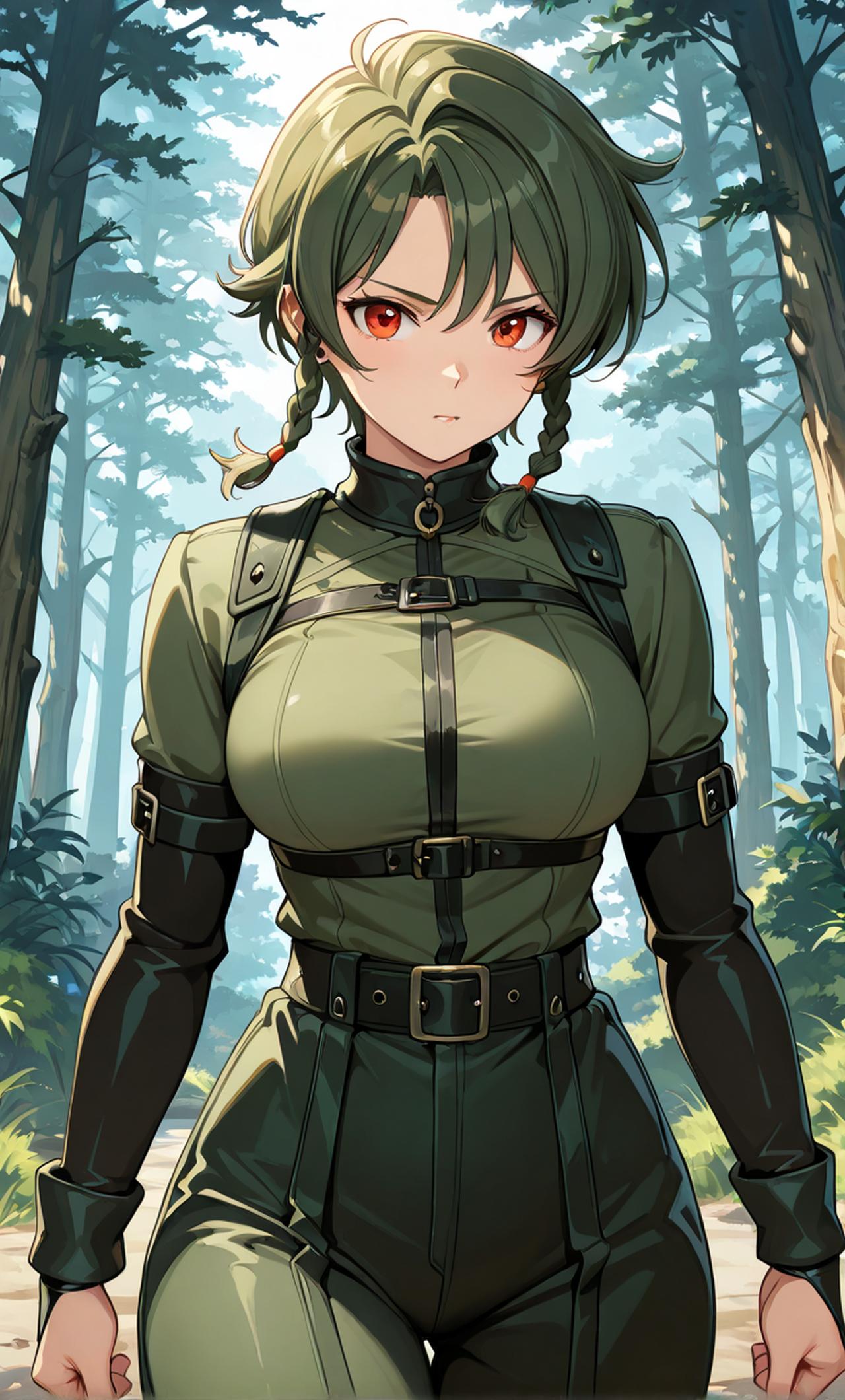 一个勇敢的女猎人,穿着棕色皮革和绿色紧身衣,她的眼睛透露出坚定和冒险精神。