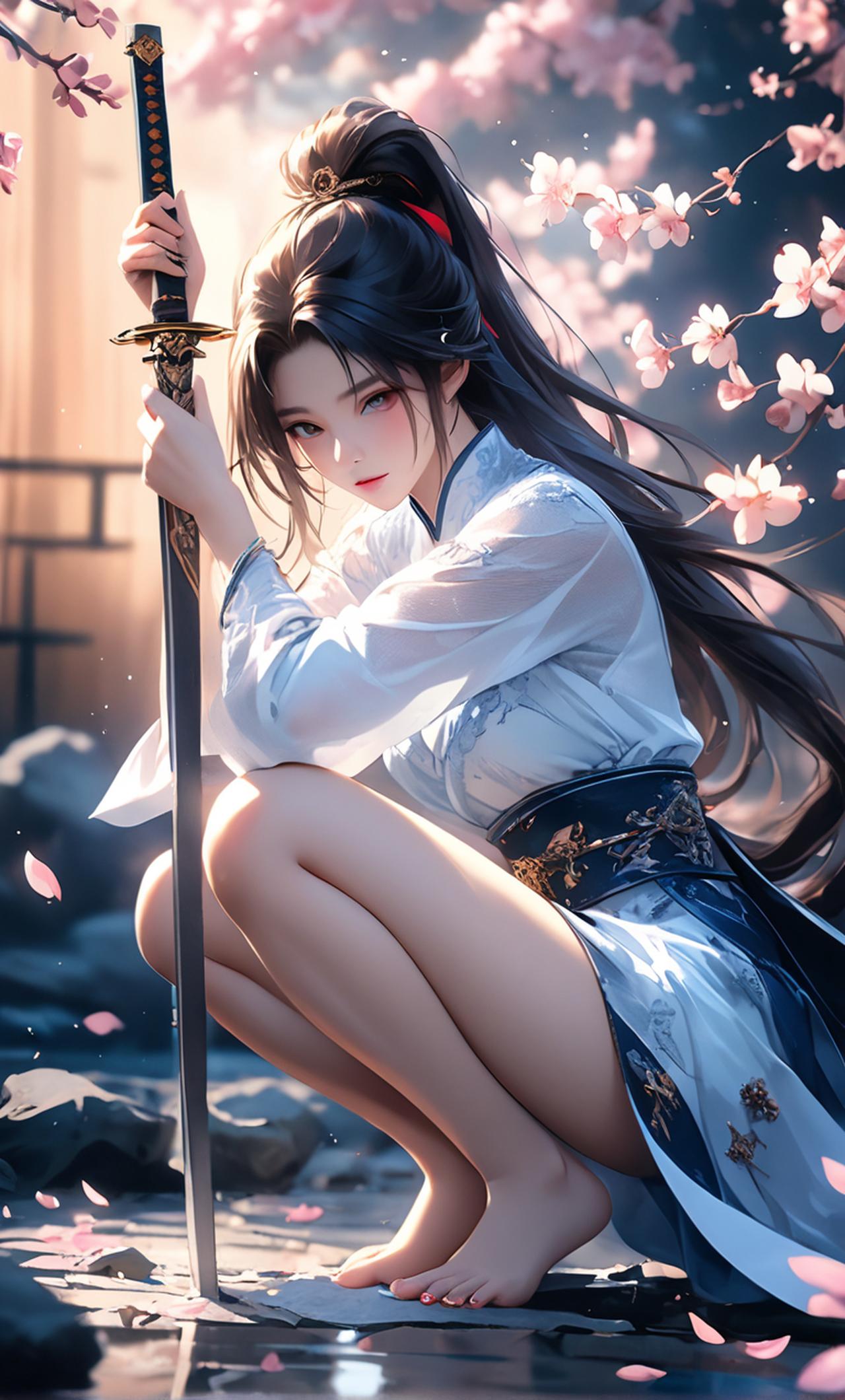 - 外貌: 细眼朱唇,容颜绝美。一头乌黑长发常随意束起,身姿高挑挺拔。身着一袭黑衣,简约而不失英气,腰间悬着雪白剑鞘的长剑与绿鞘狭刀,气质冷冽出尘,既有少女的娇俏,又有剑修的飒爽。