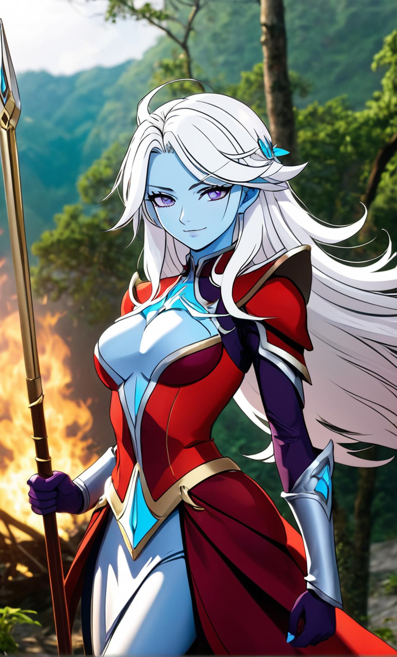 Towa is a mysterious and powerful time-traveler who wears a futuristic suit and wields advanced technology. She has long, silver hair and piercing blue eyes, often stern and composed but with a hint of mischief. Motivated by her quest to alter time for a better future, she’s both intelligent and ruthless.