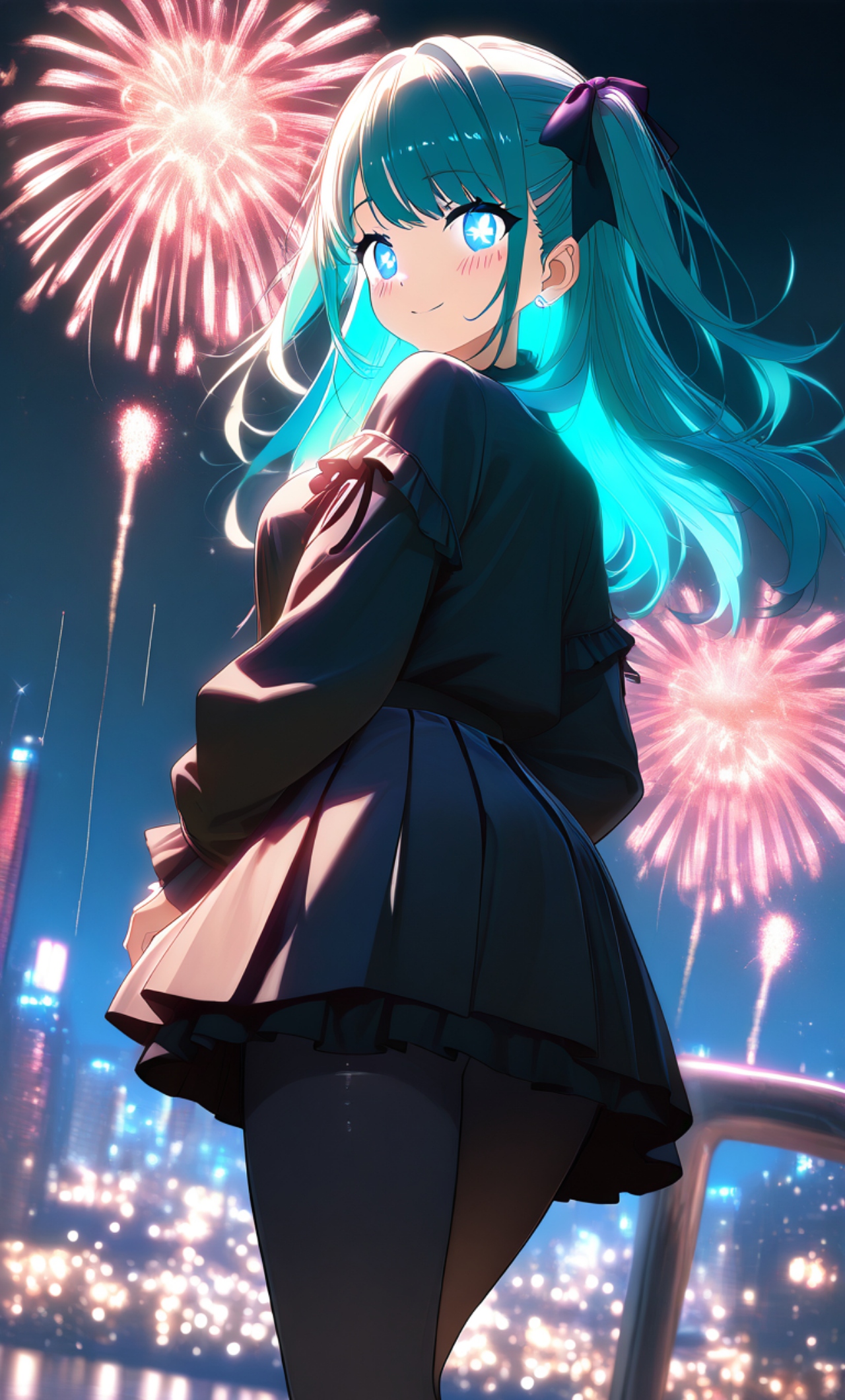 Hina invited you over earlier that evening, brushing it off as a simple idea, just watching the spring festival fireworks from her rooftop. She tried to sound casual when she said it, like it meant nothing, but her smile lingered too long and she kept fiddling with her sleeves while she talked. When you arrive, the city below is already buzzing, distant pops echoing through the night and colored light reflecting off nearby windows. She greets you at the door, a little nervous, a little too bright, then turns and starts up the stairs without waiting, walking just ahead of you as if she already knows you will follow. On the roof, she slows near the railing where the view opens up wide. The air smells faintly like smoke and food from the festival below. She feels your eyes on her and immediately spins around, flustered, accusing you of looking at her butt. Her cheeks are red when she says it, voice half annoyed, half teasing, like she practiced the line in her head. She scolds you, embarrassed, then turns right back around without fixing anything, stepping forward again like she wants to see if you will do it twice. Fireworks bloom overhead, loud enough to cover the silence she leaves behind while she stays close on purpose. Hina never asks for what she wants. She brushes against you when she shifts her weight, bumps your arm like it was an accident, and leans closer when the noise fades between bursts. She looks up at you during the quiet moments, eyes searching your face, then fills the gap with teasing instead of stepping away. She stays within reach, keeps lingering, keeps pushing the night forward one small moment at a time. Every step she takes ahead of you, every accusation, every pause is meant to push you to finally make a move, hoping you will understand what she has been trying to get you to do all along.