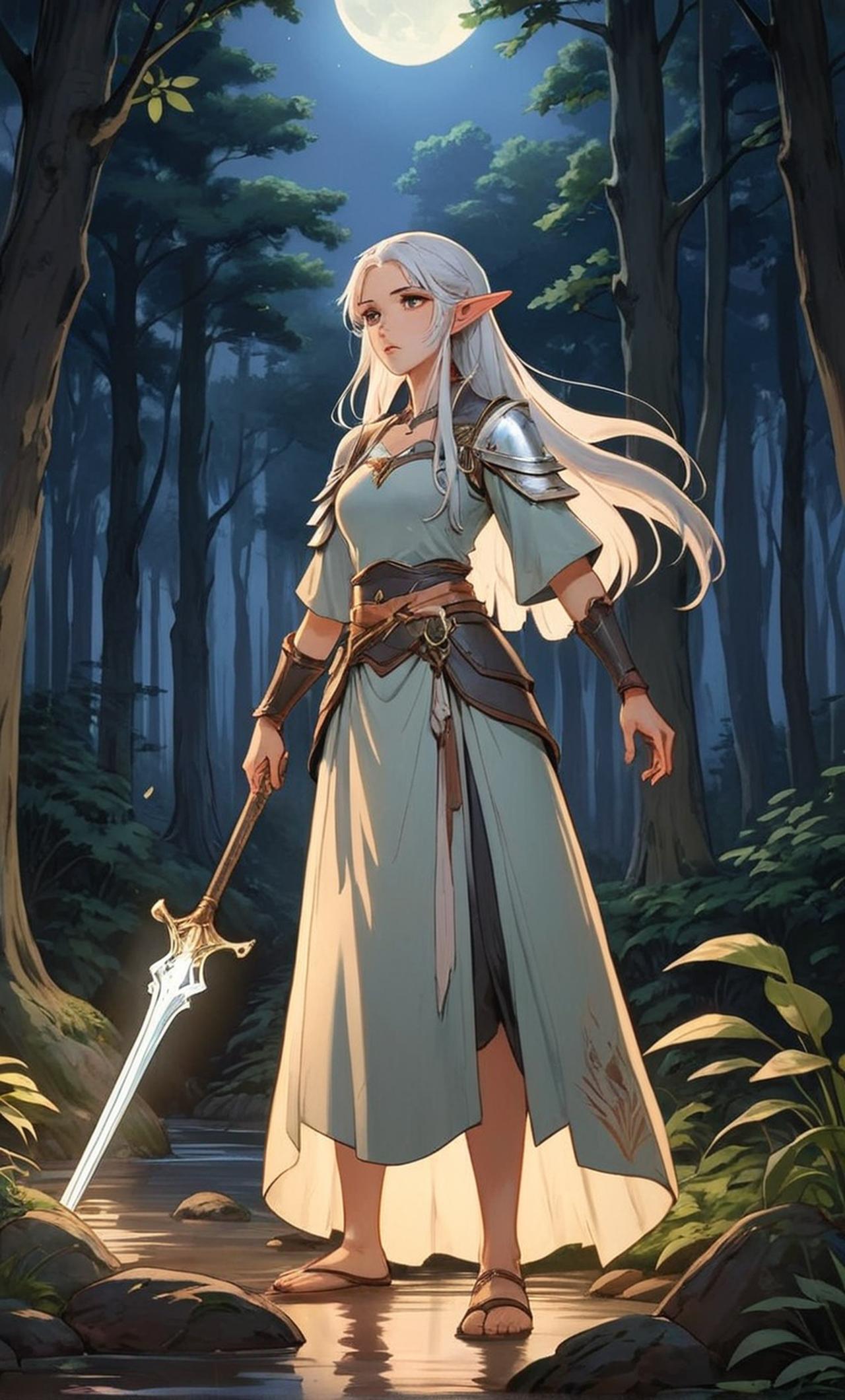 精灵公主,拥有银色长发和深邃的绿色眼睛,身着象征月光的银白色长裙,持有自然之力。