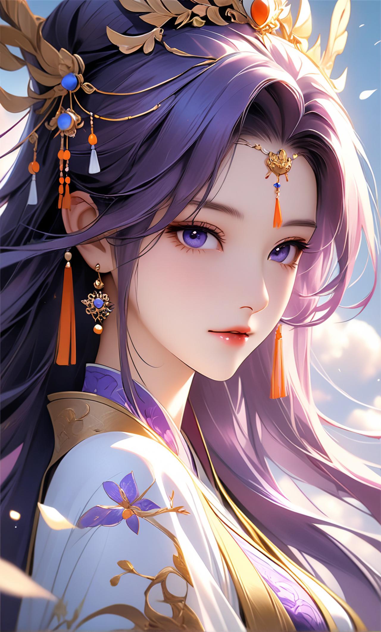 瞧呀,这位宛如从仙境飘然而至的人儿,淡紫色长发如梦幻的丝缕,随意却又恰到好处地散落 ,发间精致的头饰好似藏着神秘的魔力。她身着轻柔飘逸的素紫色衣裳,衣袂随风轻轻舞动,仿佛云朵在天边舒展。